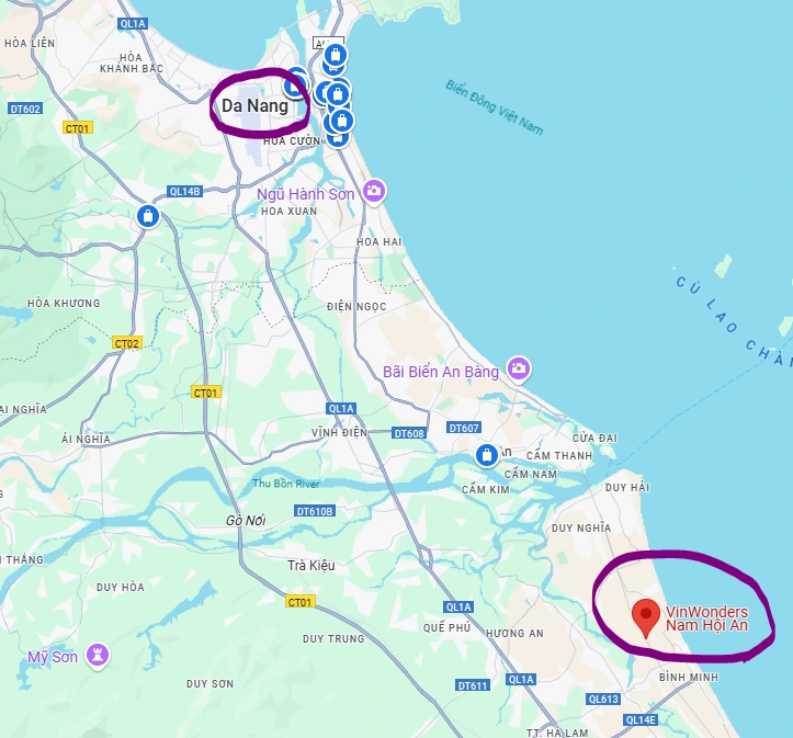 지도에서 보면 다낭에서 빈원더스 남호이안까지는 꽤 거리가 있는데 빈원더스 셔틀버스를 무료로 이용할 수 있다. 그랩(택시)이 저렴하다 해도 이렇게 먼 거리를 가면 가격이 꽤 나가니 이메일(we-care@vinwonders.com)로 예약만 하면 셔틀버스를 이용할 수 있다. 아래 이메일 예문을 첨부하니 날짜와 인원, 타는 곳만 변경해서 사용하시길... ^^