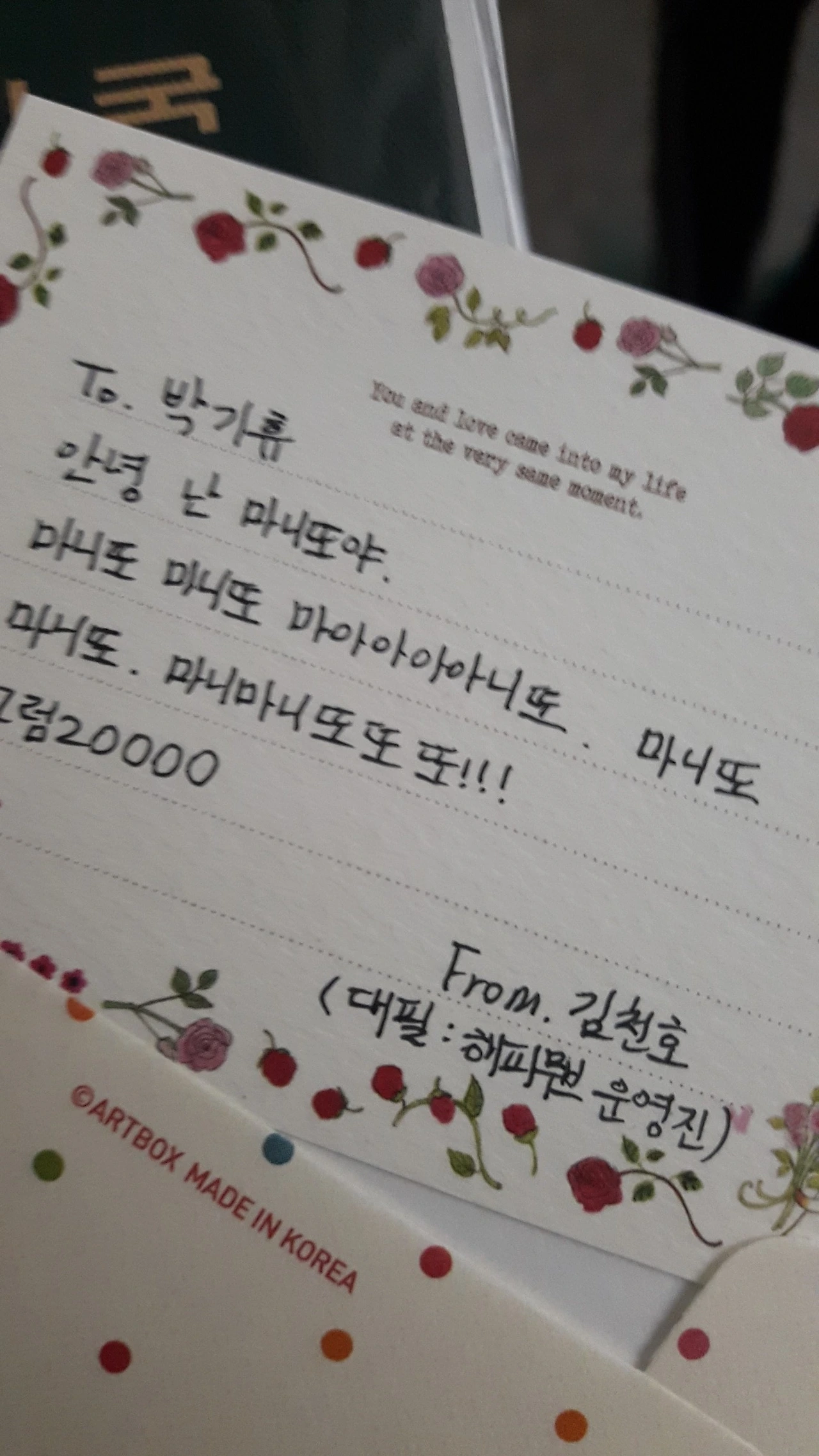 출발하기 전 우리끼리 마니또를 하기로 했는데, 눈치 없는 천호가 해피무브 운영진이 편지를 전달하는 이벤트를 했을 때 본인 이름을 숨기지 않고 내게 전달해 첫날부터 들통나 버렸다.
