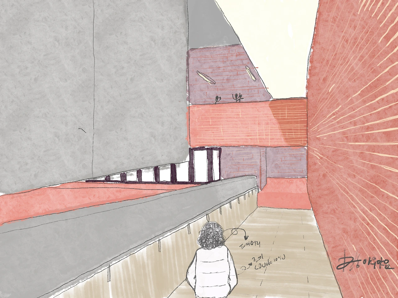 처음 박물관에 왔을 때 어플을 하나 깔았다. 하루에 10,000보를 걸으면 100포인트를 주는 어플이다. 난 하루에 이 길을 10번 이상 다니는 거 같다. 엘리베이터도 있고 다른 쪽 계단도 있는데 더 먼 이 길을 돌아가는 건 내방객들을 만나기도 하고 많이 걸어서 어플에 포인트를 쌓으려는 목적도 있었다. 난 쌓인 포인트로 커피도 사 먹고 햄버거도 사 먹었다. 지금은 귀찮아서 포인트를 안 모으지만 그 당시에는 내 주머니 가계에 커다란 도움을 주었다. 사실 이 경사로를 이용해 지하 3층에 내려가는 걸 권장한다. 이유는 이 건물의 구조를 이 길을 통해 어느 정도 짐작할 수 있기 때문이다.