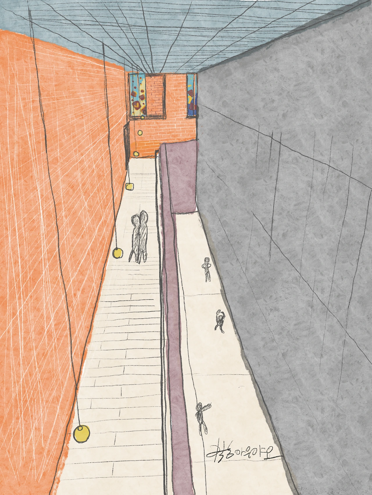 지금 그림으로 표현한 이곳은 일반 내방객이 못 들어가는 곳이다. 이곳에서 바라본 곳은 내방객들이 박물관 지하 3층으로 내려가는 경사로이다. 높으곳에서 바라볼 수 있는 이곳은 내방객들이 못 보지만 재미있는 구도로 되어있다. 오른쪽 검은색 박스 안에서는 미디어 영상이 4면으로 가득하고 정면 빨간 벽돌 위로 스테인드글라스 작품이 보인다. 실재로는 빛이 적게 들어와 밝지 않지만 그림으로는 환하게 그려보려 했다. 아무튼 이 경사로는 박물관의 가장 중요한 부분과 연결되어 있고 이 경사로에 연결된 장소만 해도 4개에 이른다.