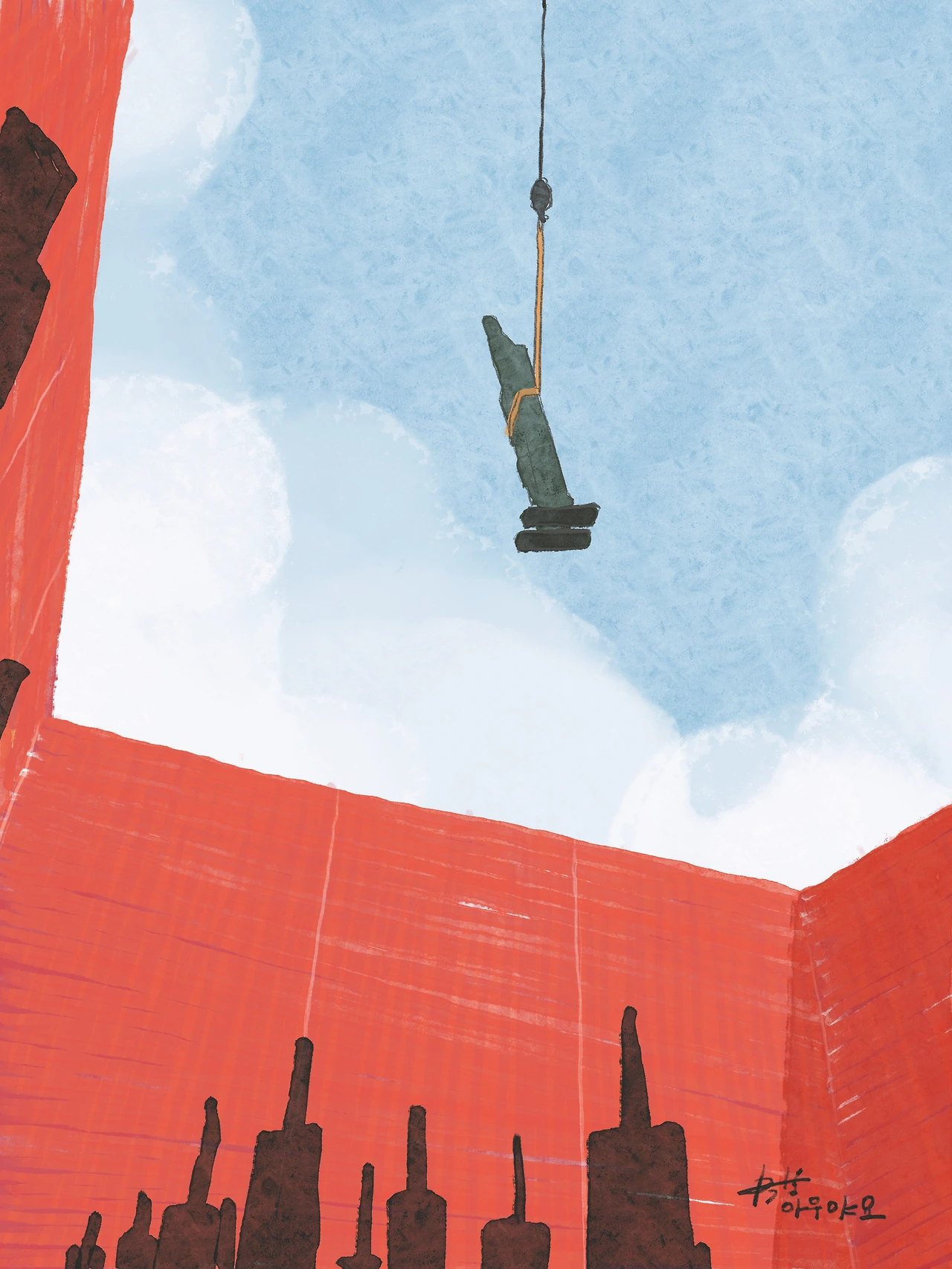 잠시 이 작품이 평화의 전시를 위해 떠났다. 여름에 다시 돌아온다는 약조를 한 후 하늘에서 내려오는 크레인을 타고 놀러 나갔다.