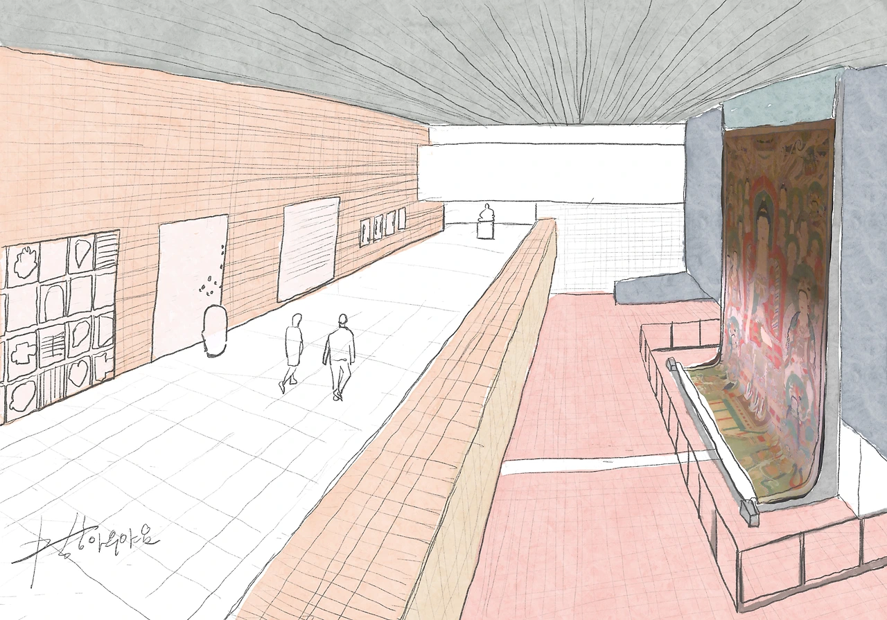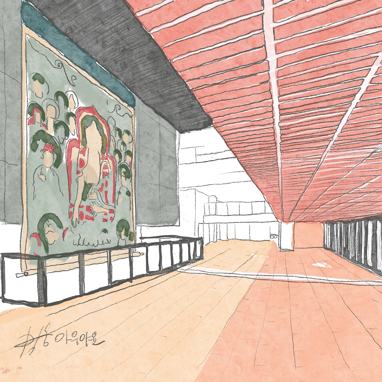 그리고 박물관 콘솔레이션 홀, 위로의 공간에 자리를 차지하고 있다. 12미터 높이의 이 괘불은 박물관의 가장 높은 공간보다 컸다. 그래서 아래의 두루마리 부분이라 해야 하나? 그 부분은 둘둘 말려서 전시를 했다.
