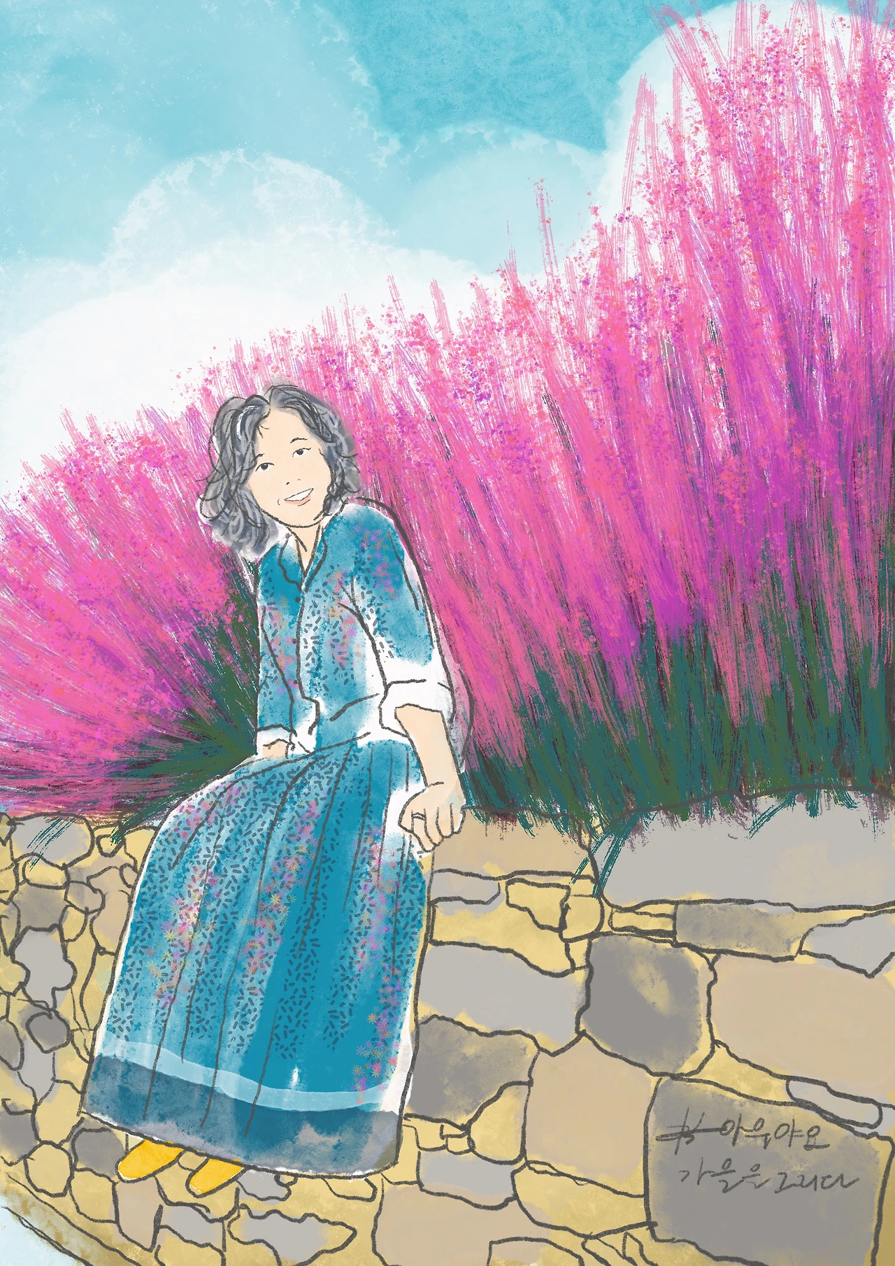 핑크뮬리 가득한 곳에 짝지가 앉아있다.