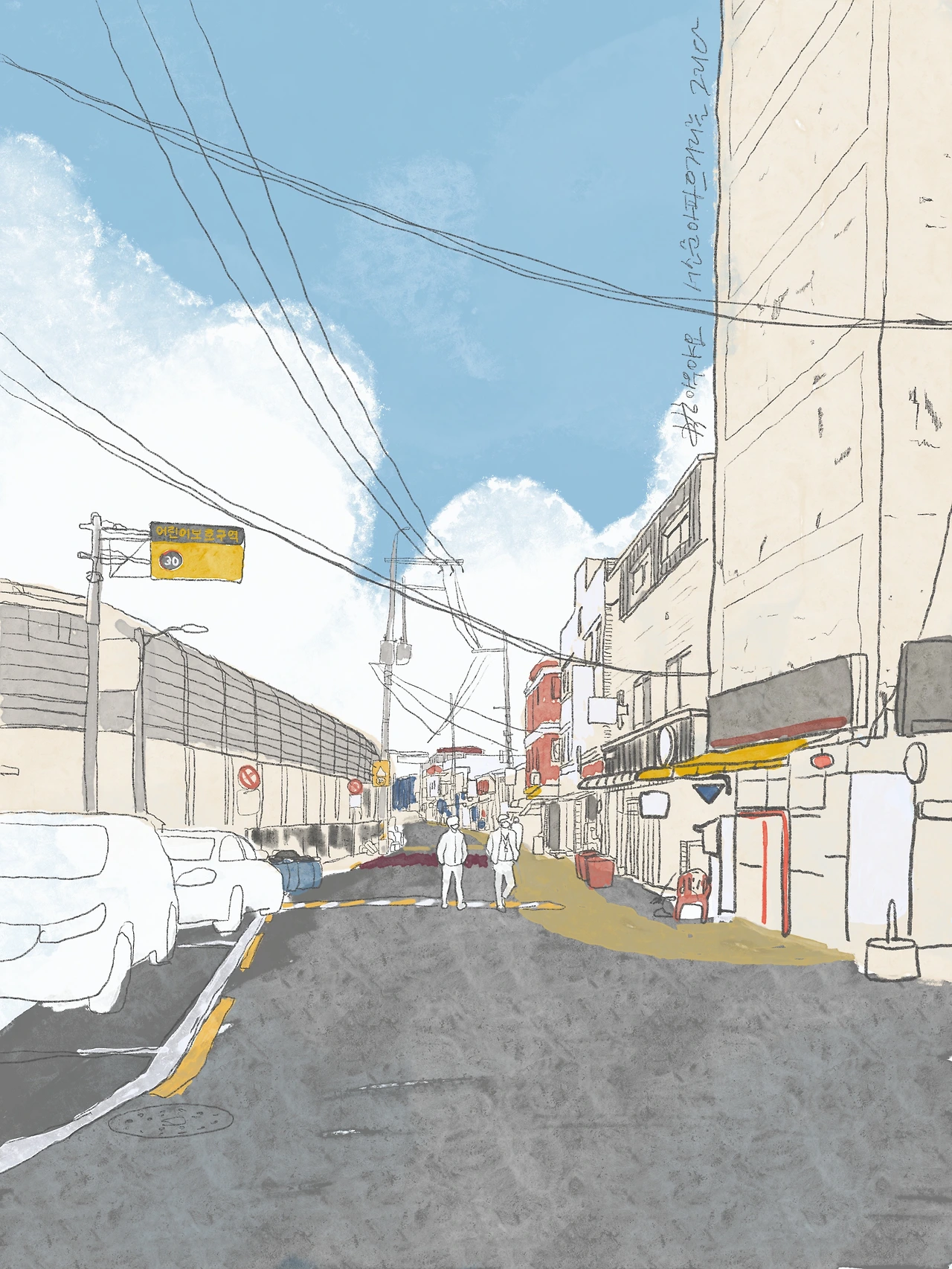 일단 기찻길을 건너 횡당보도를 넘어가면 아파트와 철길 담벼락 사이로 굽이도는 좀 큰 골목길이 나온다.