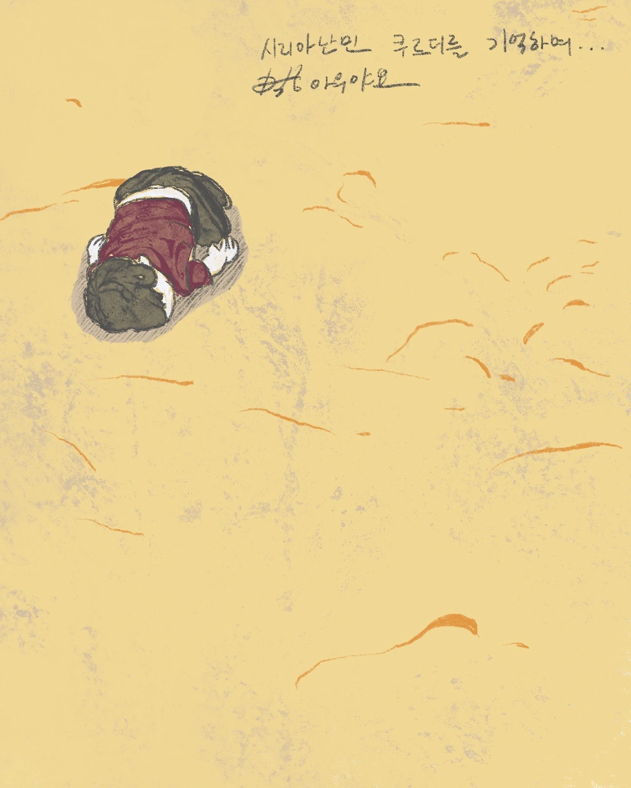 몇 해 전 중동에서 큰 분쟁이 일어났다. 그 당시 많은 피난민들은 시리아를 떠나 유럽으로 망명을 하려 했지만 여러 가지 이유로 거절당하기 일쑤였다. 작가는 그 당시 더 안전한 세상을 향해 그리스를 향하다 비극적으로 생을 마감한 쿠르디의 터키 해변 발견 모습을 하늘광장에 재현했다.