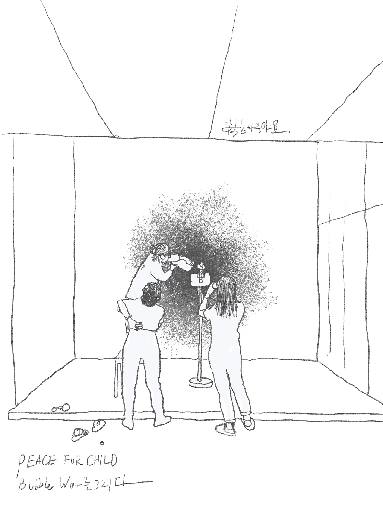 이 그림은 학예사들이 박물관 개관전에 비눗물을 공급하는 모습을 스케치하였다.