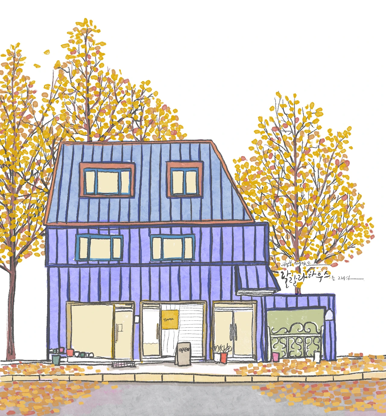 지역활동가들에게 처음으로 #수원에 살고 있는 #아우야요그림책 작가를 소개해 준 #랄랄라하우스 를 그리고 싶어서 내가 좋아하는 가을로 표현했다. 그리고 가장 어울릴 거 같아서 내 맘대로 ㅎ