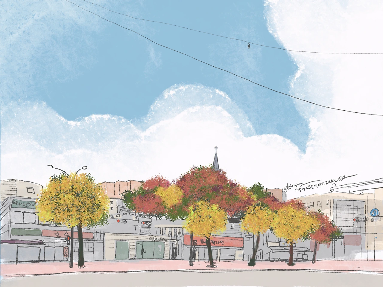 지금은 주변 풍경이 살짝 달라져서 그려보고 싶지만 그때를 기록하지 못한 그림이 되었어.