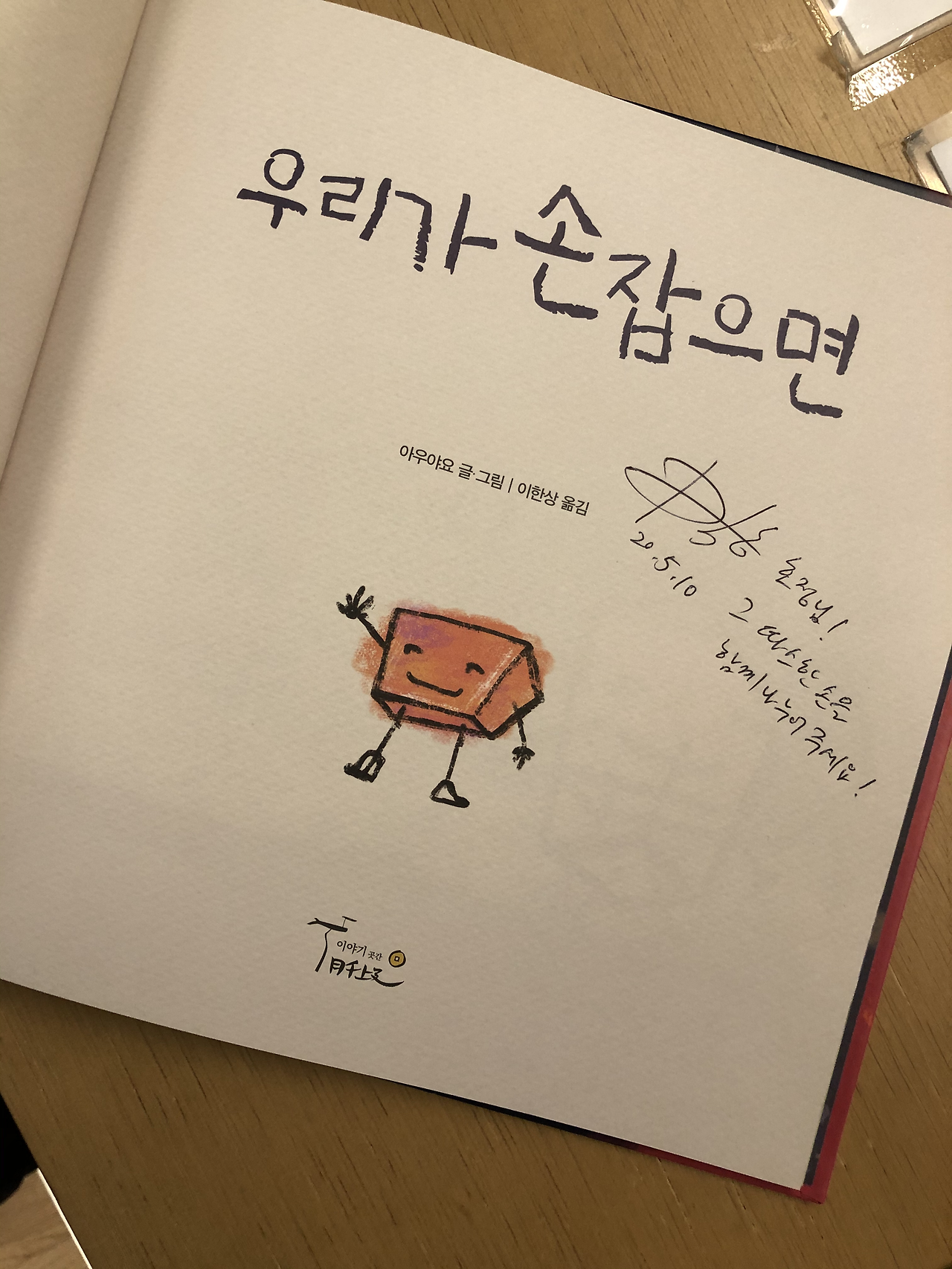 그리고 가방에서 나의 첫 그림책 ‘우리가 손잡으면’ 책을 꺼내신다. 오랜만에 뵙고 사인을 했다. 당연히 기분이 좋다. 정말 행복한 느낌이다.