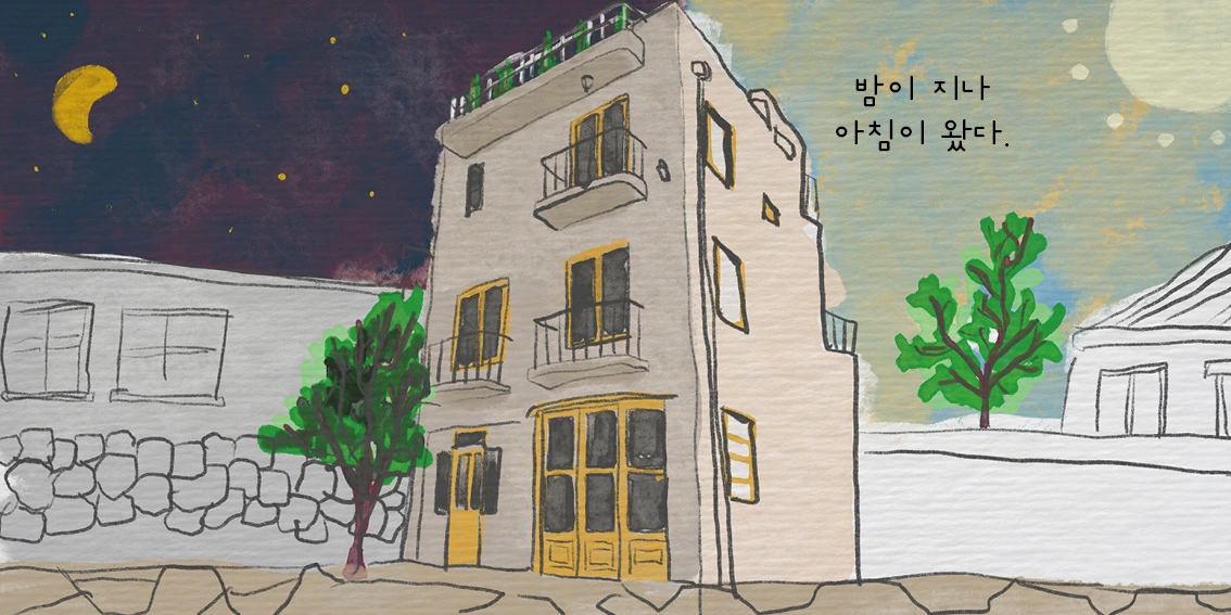 그림은 주 건물을 두고 밤과 낮의 시간차를 표현했다. 얼마나 흐른 걸까? 하루? 이틀? 그건 모른다. 어쩌면 엄마에게 아주 긴박한 시간을 다 보내고 여유가 왔을지도? 아이에게는 새로운 놀이가 왔을지도? 아니면 바로 그다음날일지도 모른다.