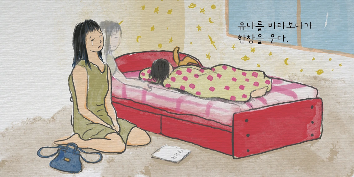 처음에는 엄마의 얼굴을 확대해서 표정의 변화를 만들어보려 하였다. 피곤한 얼굴에서 무표정한 얼굴로 바뀌고 그러고 나서 눈물을 흘리는 장면으로 가려하였다. 그랬더니 그냥 술 취한 분의 주정으로 보일까 봐 아이방의 전체를 보여주고 엄마가 앉아있으면서 딸을 만져주려다가 마는 모습으로 바꾸었다.