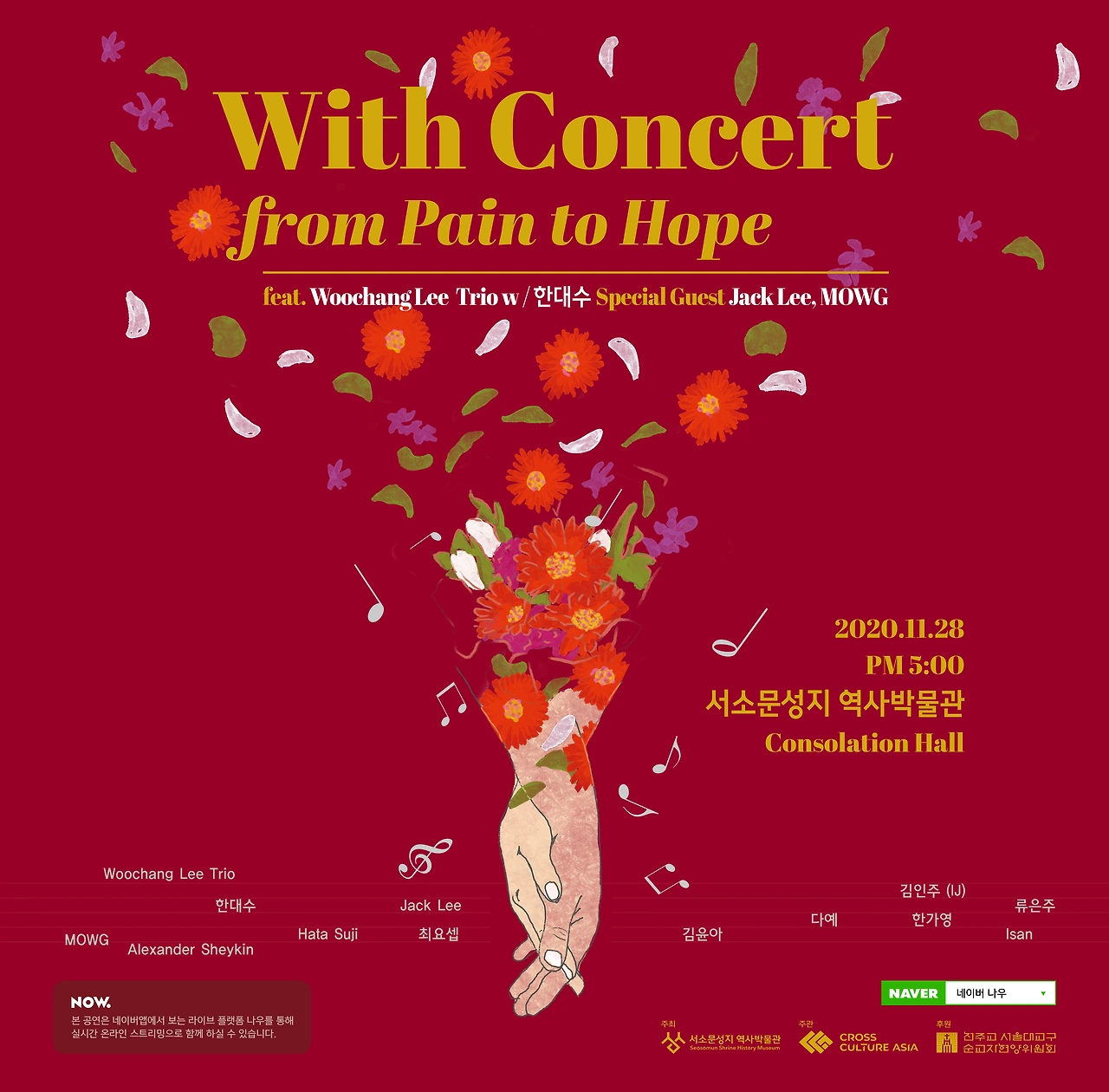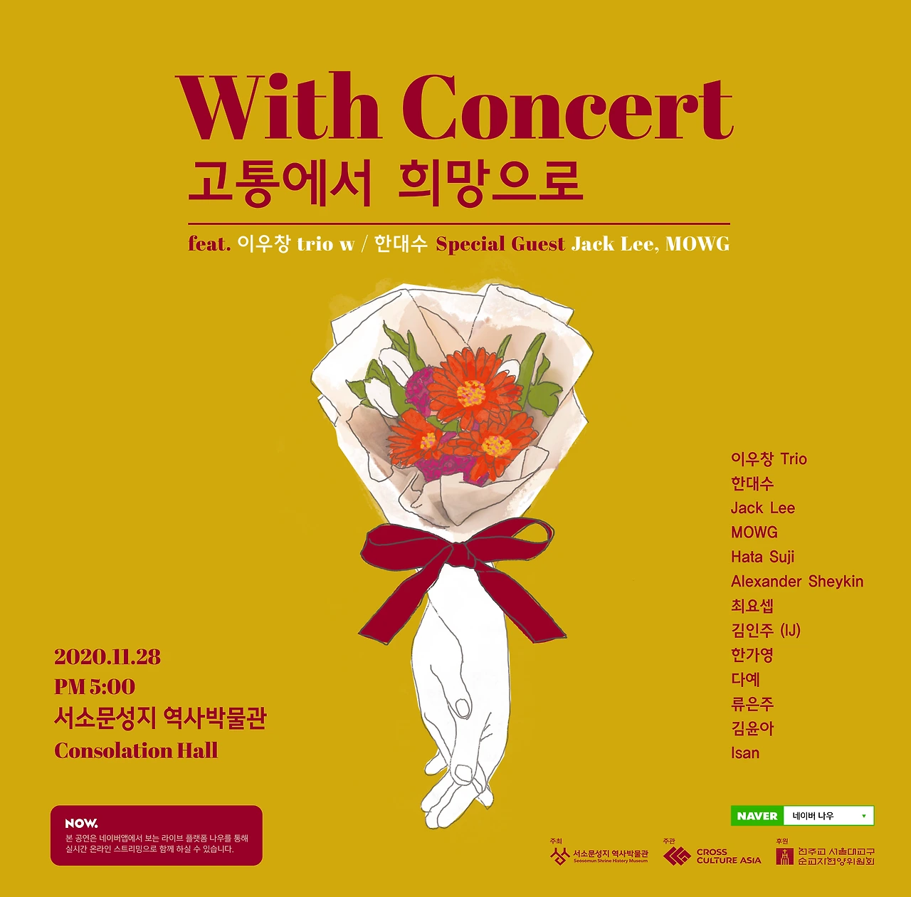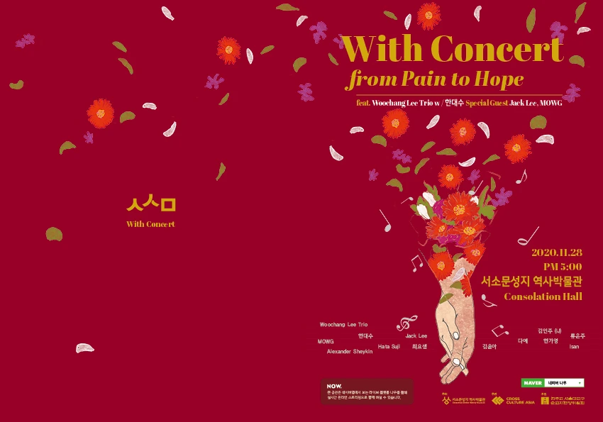 이 음악회에는 세계적인 뮤지션들이 참여를 했다. 팬데믹 시대에 With Concert - from Pain to Hope이라는 주제로 난 뮤지션이 아니지만 이 콘서트를 이미지화시켰다. 먼저 기획팀에서 나온 기획을 가지고 또 다른 디자인 기획을 한다. 디자인 기획은 선물이다. 그것도 꽃 선물!..... 이 꽃 선물이라는 아이디어는 박물관을 지나던 중 봉사자님께서 나에게 지쳐 보인다고 힘내라고 천일홍을 가지고 꽃송이 다발을 만들어 선물해주셨다. 그리고 브런치 작가님께서 박물관에 방문하실 때 말린 장미 꽃송이를 ‘노숙자 예수’ 조각상 밑에 선물해 주셨다. 이 느낌을 표현하기 위해 난 아우야요 작가에게 그림 의뢰를 했다. "우리가 손잡으면" 그림책 작가인 아우야요 작가는 부캐의 능력을 발휘해 열심히 그림을 그렸다. 기획팀에서 나왔던 손을 맞잡는 기획! 이 시기에 오히려 손을 맞잡는 게 얼마나 중요한지를 아우야요 작가가 그림으로 표현했다. 그리고 그 그림을 내가 디자인했다. 아우야요 작가의 작품이 빛나게 색감 및 텍스트 디자인, 액세서리 등을 넣어 완성했다. 시안이 여러 개 만들어지고 그중에 선택되는 선물 같은 메인 이미지가 만들어졌다. 또한 메인 디자인이 나오니 이 디자인은 여러 갈래로 뻗어나갔다. 이 메인 디자인으로 난 더 흩날리는 듯한 느낌의 리플릿을 만들었다. 그리고 영상팀에서 영상제작에 이 소스들을 이용했다.