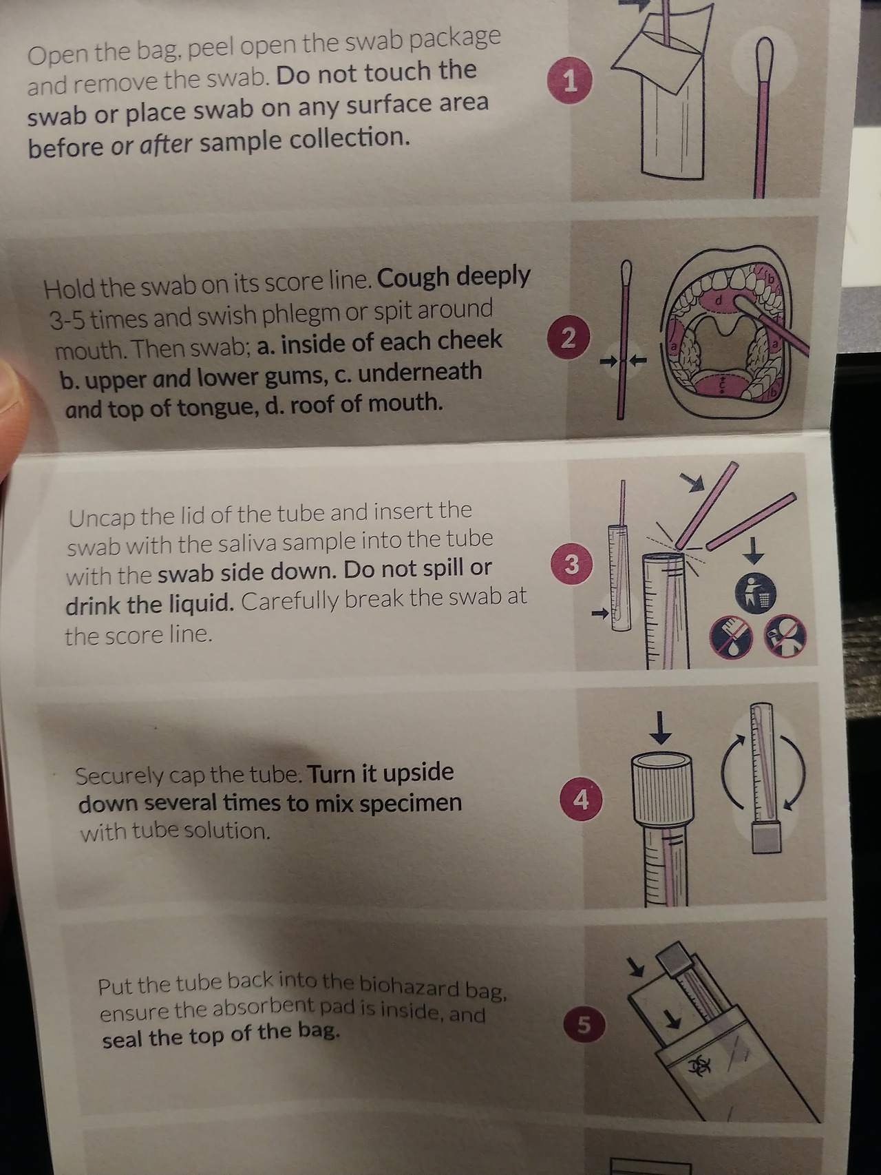 켁켁켁켁 강하게 기침을 3번 하고 킷 안에 있는 면봉으로 매뉴얼에 나와있는 구강 내의 부분을 터치하여 동봉된 플라스틱 케이스에 넣으면 끝이었다. 면봉을 넣고 위아래로 몇 번 흔든 뒤에 내 예약번호가 적힌 봉투에 다시 넣어 비치된 통에 넣고 가면 끝이었다. 검사의 정확도는 89%라고 나와있어서 테스트 결과에 대한 신뢰는 글쎄...