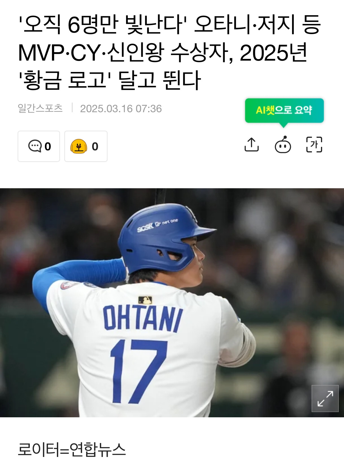 기사를 읽어보니 MVP, 사이영상. 신인왕 세 분야의 선수들 x2 (양대리그) 이렇게 총 6명 만이 유니폼에 골든 패치, 일명 황금 로고를 달고, 나중엔 이 패치를