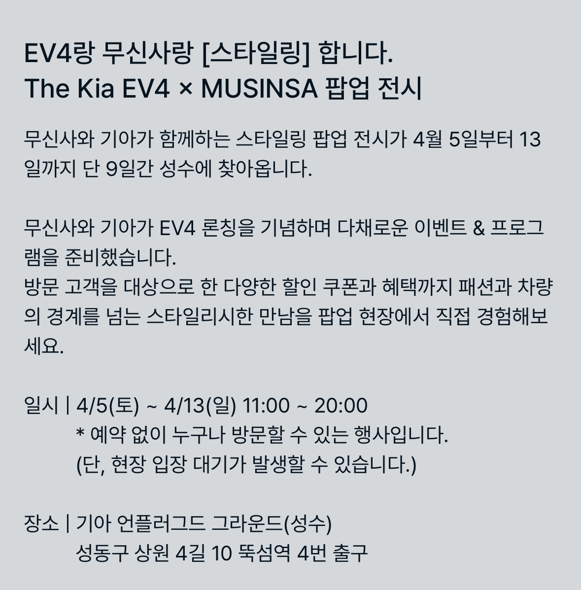 참, 기아와 무신사의 이번 컬래버레이션 기사를 본 건 3~4일 전이고 오늘에서야 논평으로 다루는 것인데, 살펴보다 보니 공교롭게도 오늘부터 성수동에 기아 언플러그드 그라운드에서 팝업 전시를 진행한다고 한다. (광고도 아닌데 제대로 광고하고 있음.. 매번 말하지만 진짜 광고면 더 좋겠음. 하하)