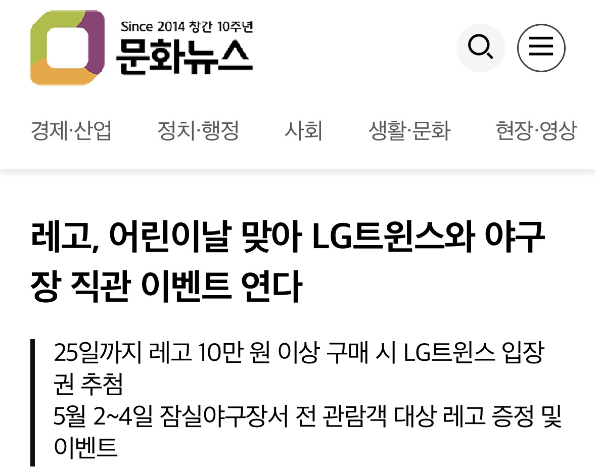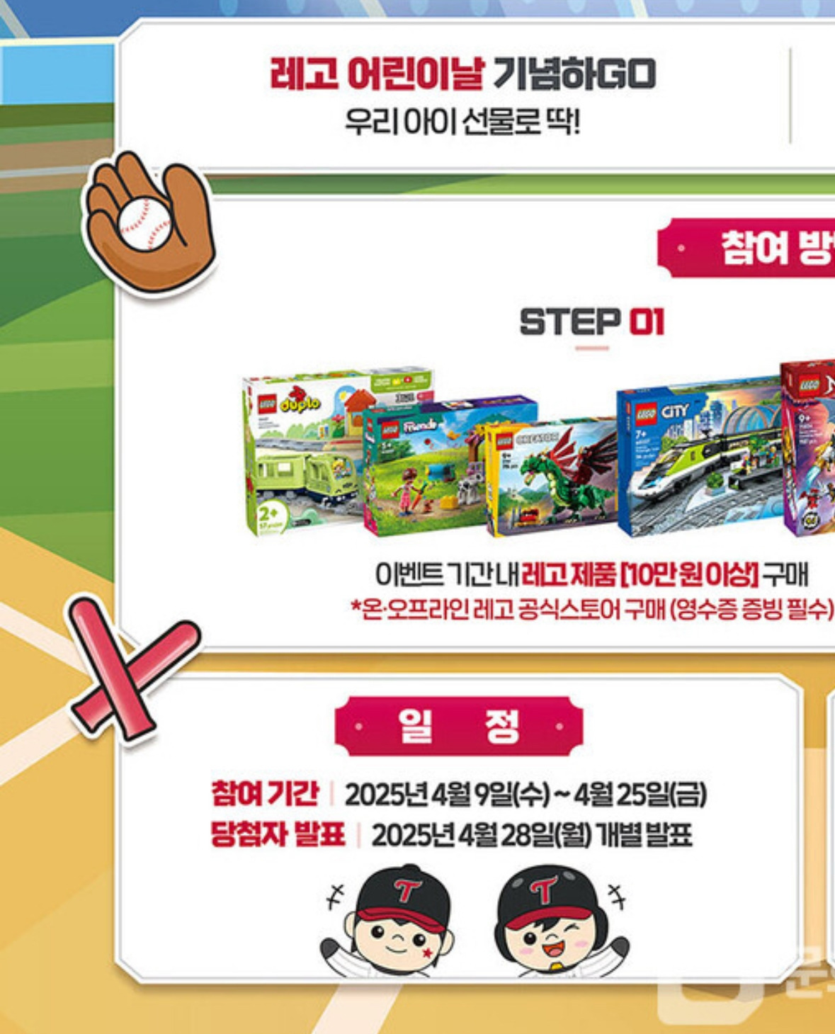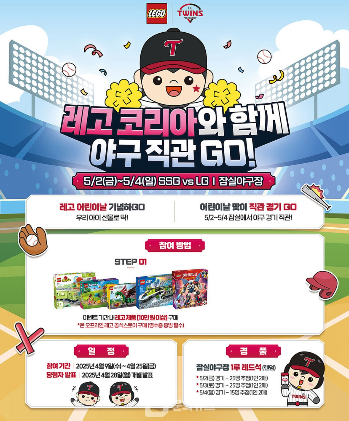 레고코리아와 LG트윈스가 어린이날을 맞아 직관 이벤트를 연다는 내용이었디.