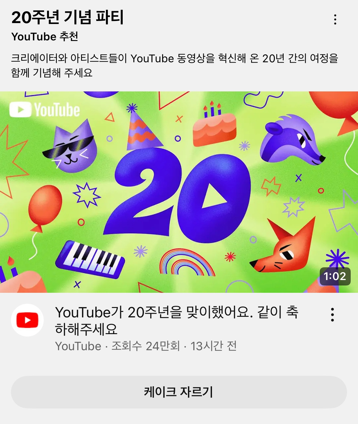 우리의 일상에 지대한 영향을 끼친 유튜브가 어느새 20주년이라니 새삼 놀랍기도 하면서, 한편으론 아직 20년 밖에 안됐나 싶은 아이러니함.