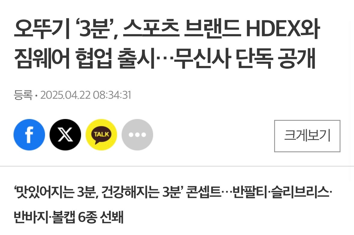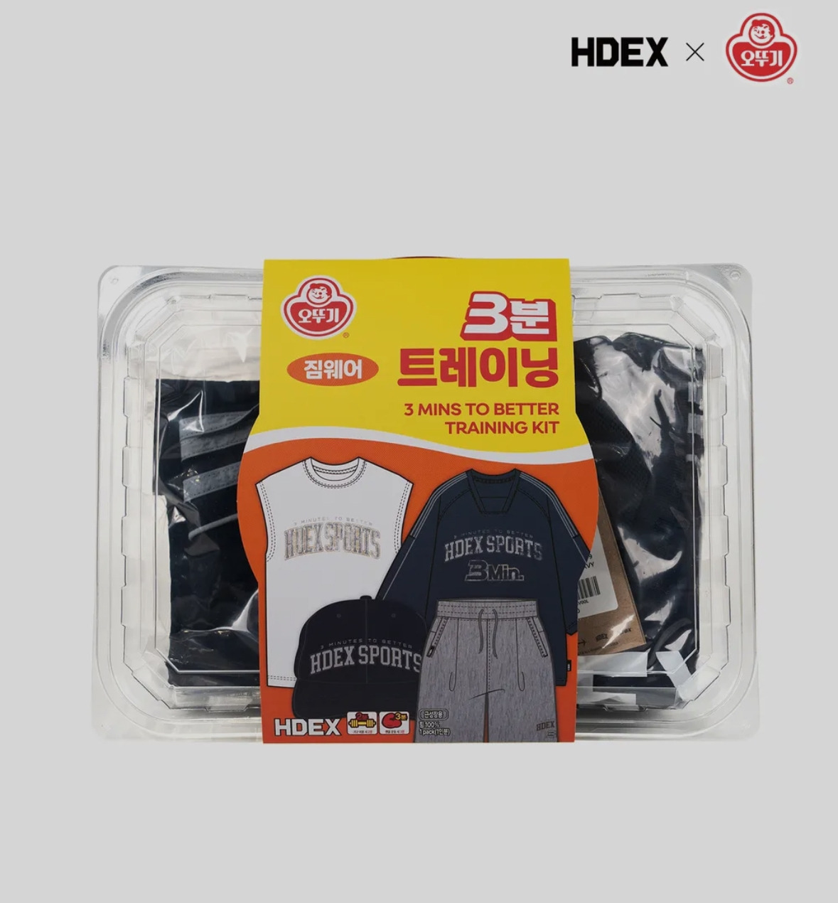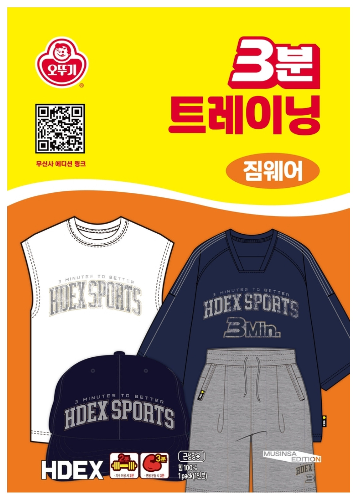 3분 카레, 3분 요리 등의 ‘3분’ 키워드의 자산을 갖고 있는 오뚜기에서 스포츠 브랜드인 HDEX와 협업해 상품을 출시하고, 무신사를 통해 판매하는 전형적인 구조의 기획이다.
