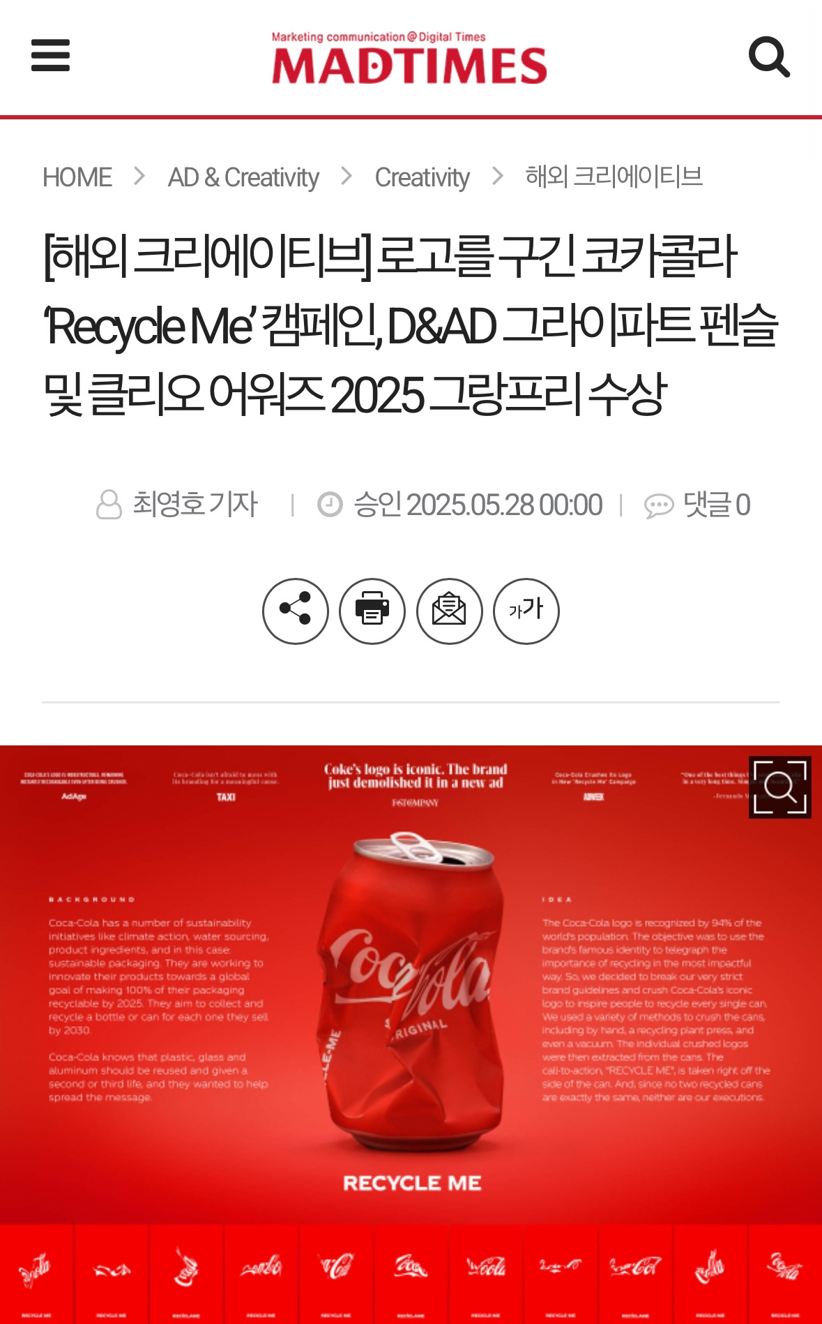 코카콜라가 지난해 선보인 리사이클미(Recycle Me)가 2025 클리오 어워즈에서 그랑프리를 수상했다는 소식이었다.