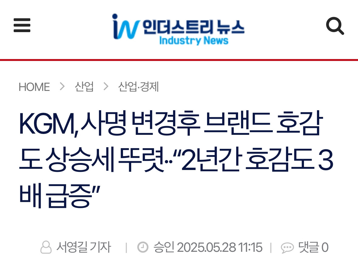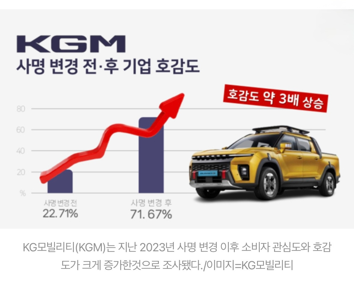 내용인즉슨, 2023년 KGM으로 사명을 변경하고 약 2년 동안 온라인 정보량이 두 배 증가(101.3%), 긍정률은 75.14%, 순호감도는 71.67%로 사명 변경 이전보다 3배 상승했다고 한다.