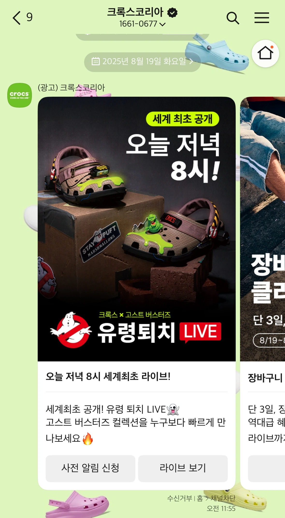 얼마 전에 크록스 코리아로부터 받은 메시지 (안 좋아한다면서 카카오톡 채널 가입이 된 이유는 아내가 프로모션 혜택을 받기 위해 가입시켰..)