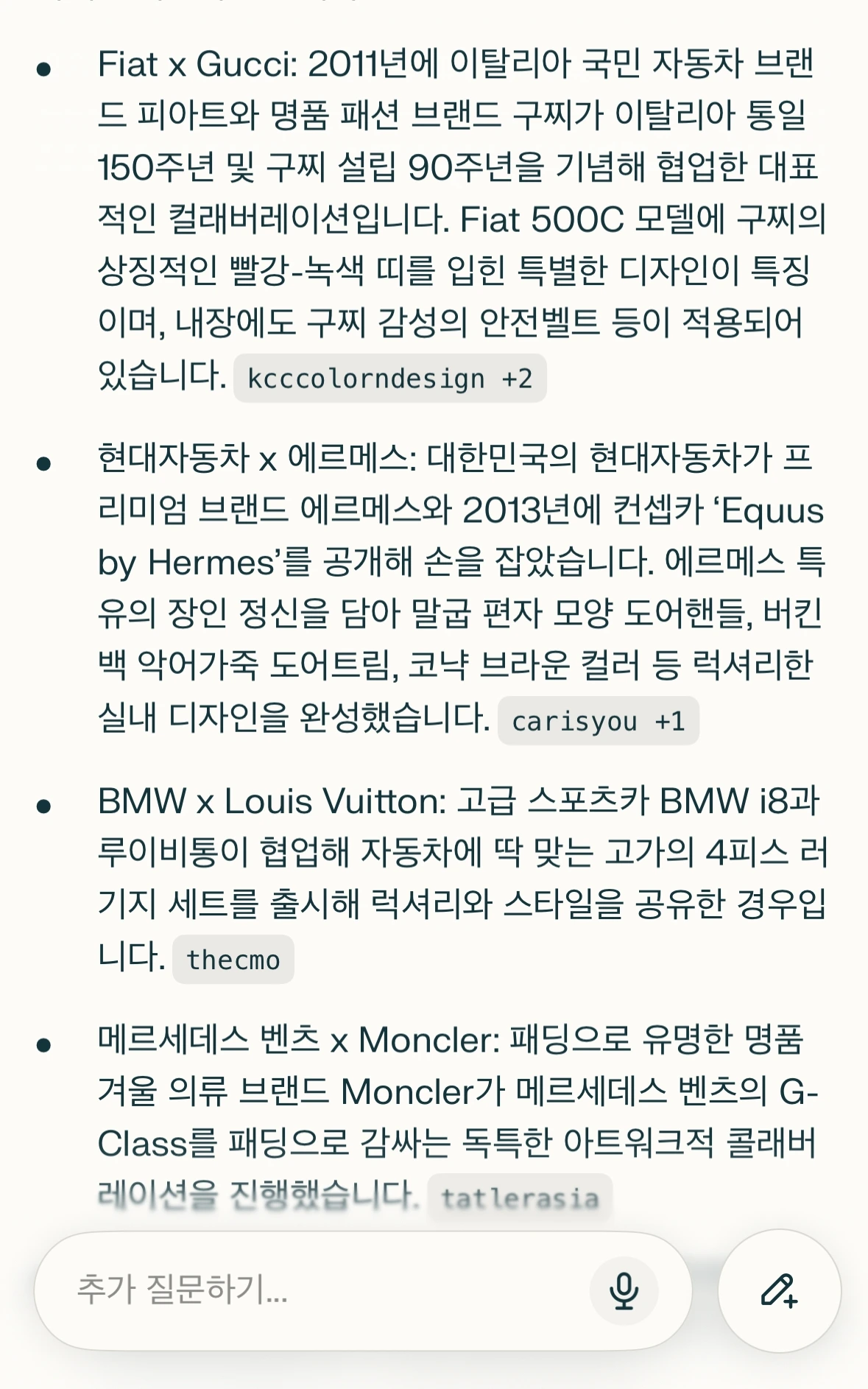 피아트 x 구찌 등이 떠오르는데, 퍼플렉시티에 물어봤다. (요즘은 생각보다는 AI부터 찾는.. 의존도가 너무 큰 것 같아서 문제이긴 함)