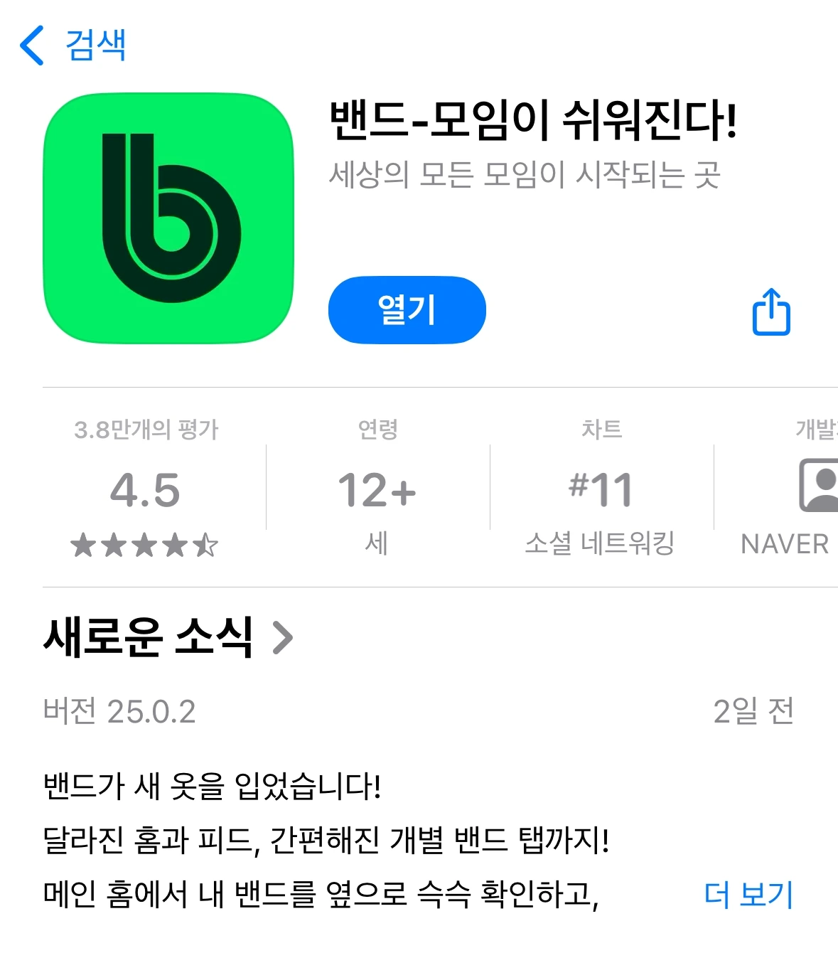 개인적으로 네이버 밴드의 b자 로고를 그리 좋아하진 않았는데 전반적인 톤은 블로그와 마찬가지로 블랙의 이미지가 강해졌다.