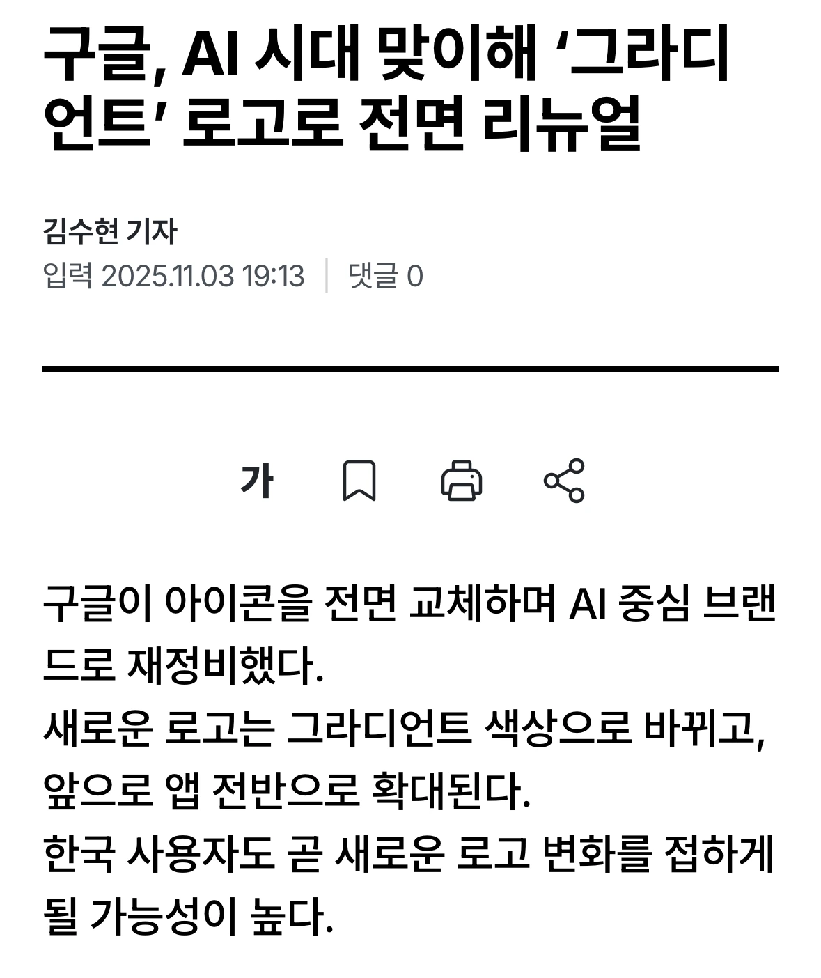 AI라는 대홍수의 시대에서 서비스는 물론 디자인도 큰 물결을 타고 진화하고 있다. 구글의 기존 컬러 스킴도 이미 10여 년 가까이 운영해온 터라 발맞춰 변화 혹은 진화도 필요했음에는 동의할 수 있다.