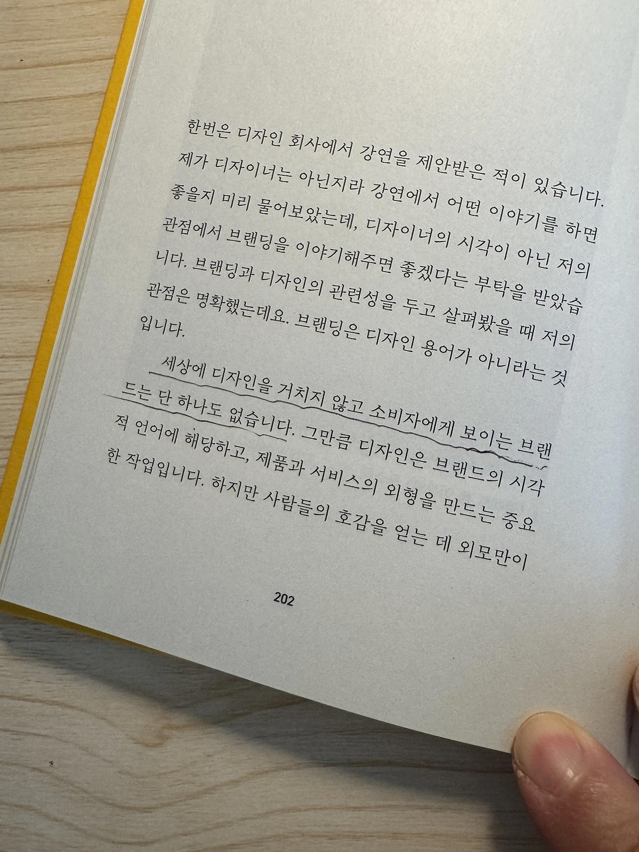 본 책의 주제를 관통하는 문장이 아닌 브랜딩은 디자인 분야의 용어가 아님을 설명하는 중에 나온 표현이지만, 디자이너 입장에서 너무나 강하게 꽂힌 문장이었다.