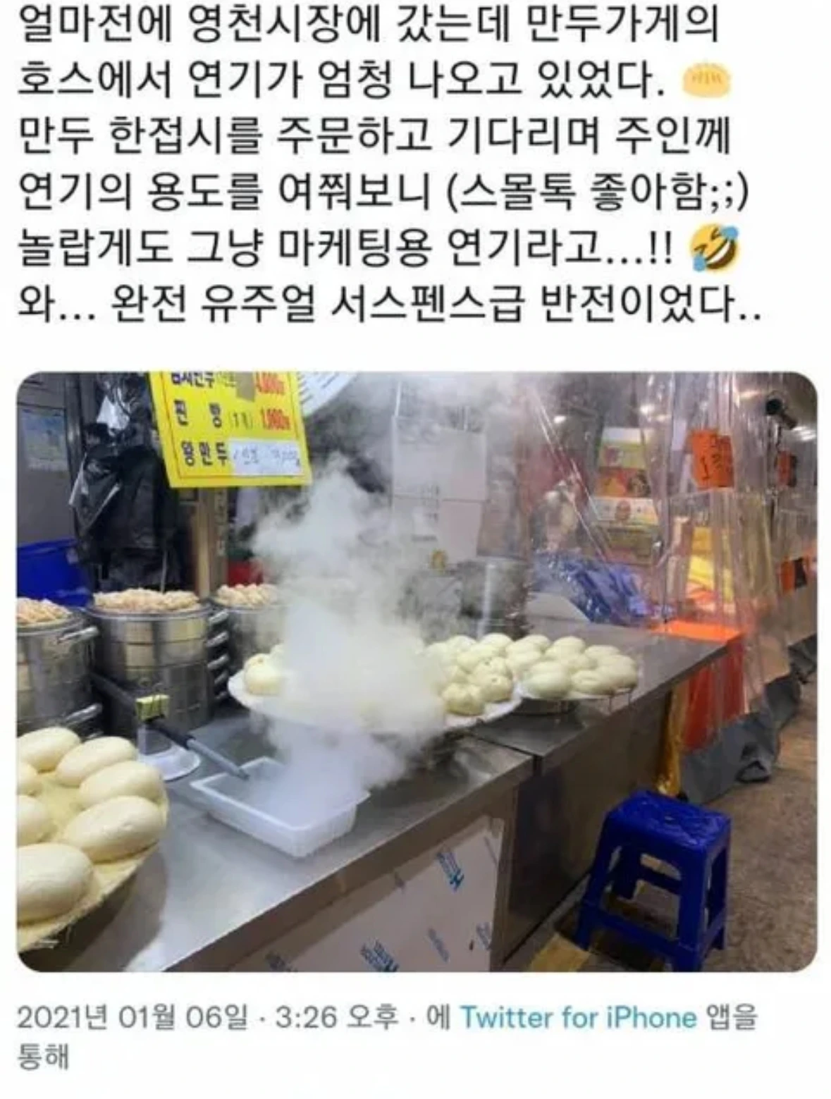 아니면 정겨운 만둣집, 찐빵집 뒤덮은 하얀 수증기 느낌은 아니려나 궁금해진다.