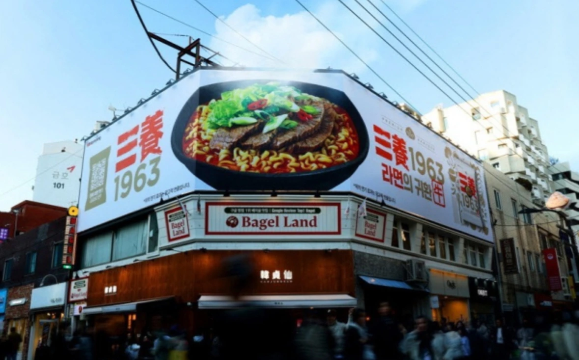 옥외광고 간판에 김이 모락모락 피어오르는 라면이라니 흥미롭다.