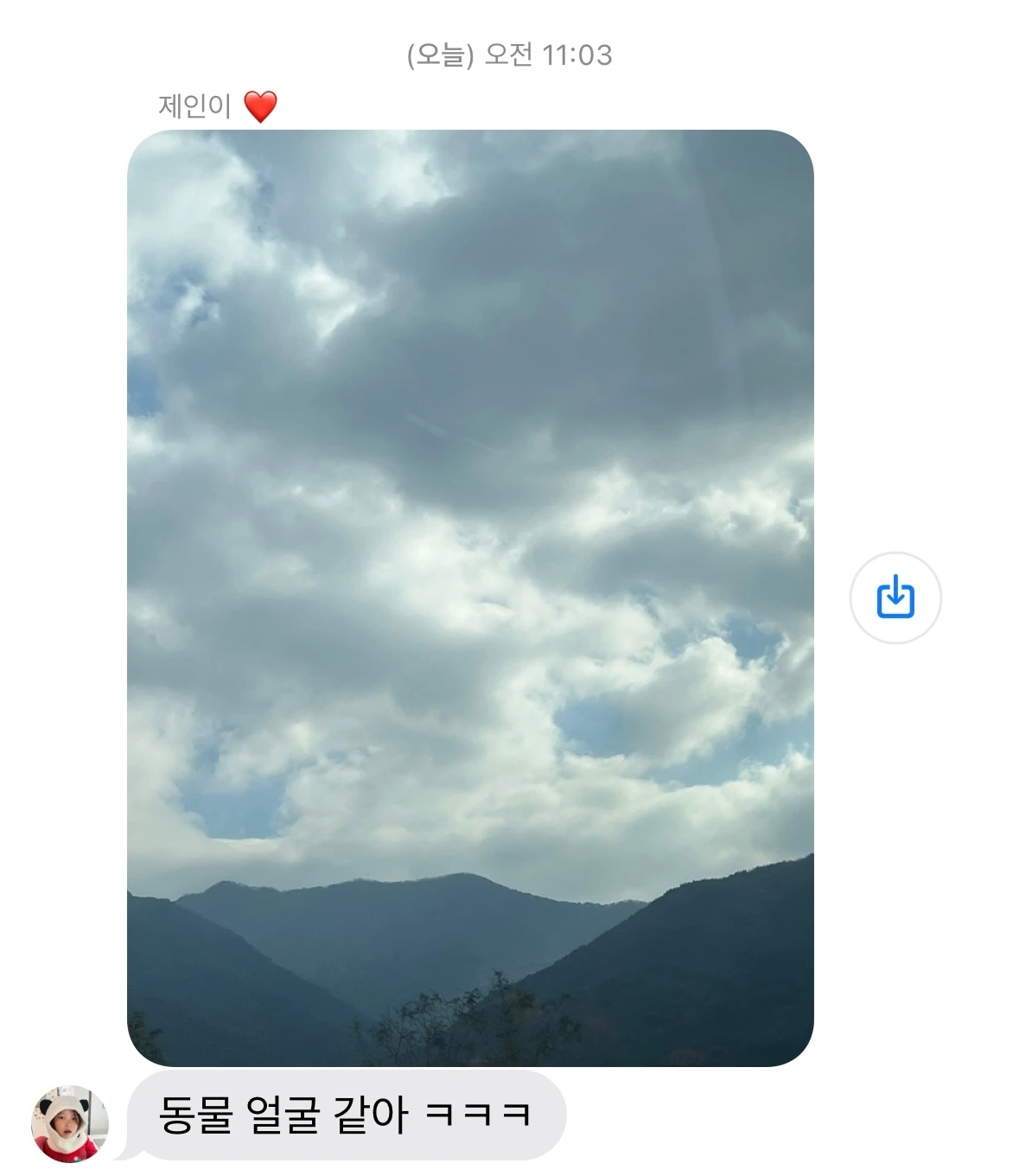 뒷자리에 앉은 딸내미가 하늘 사진과 함께 문자를 보낸다.