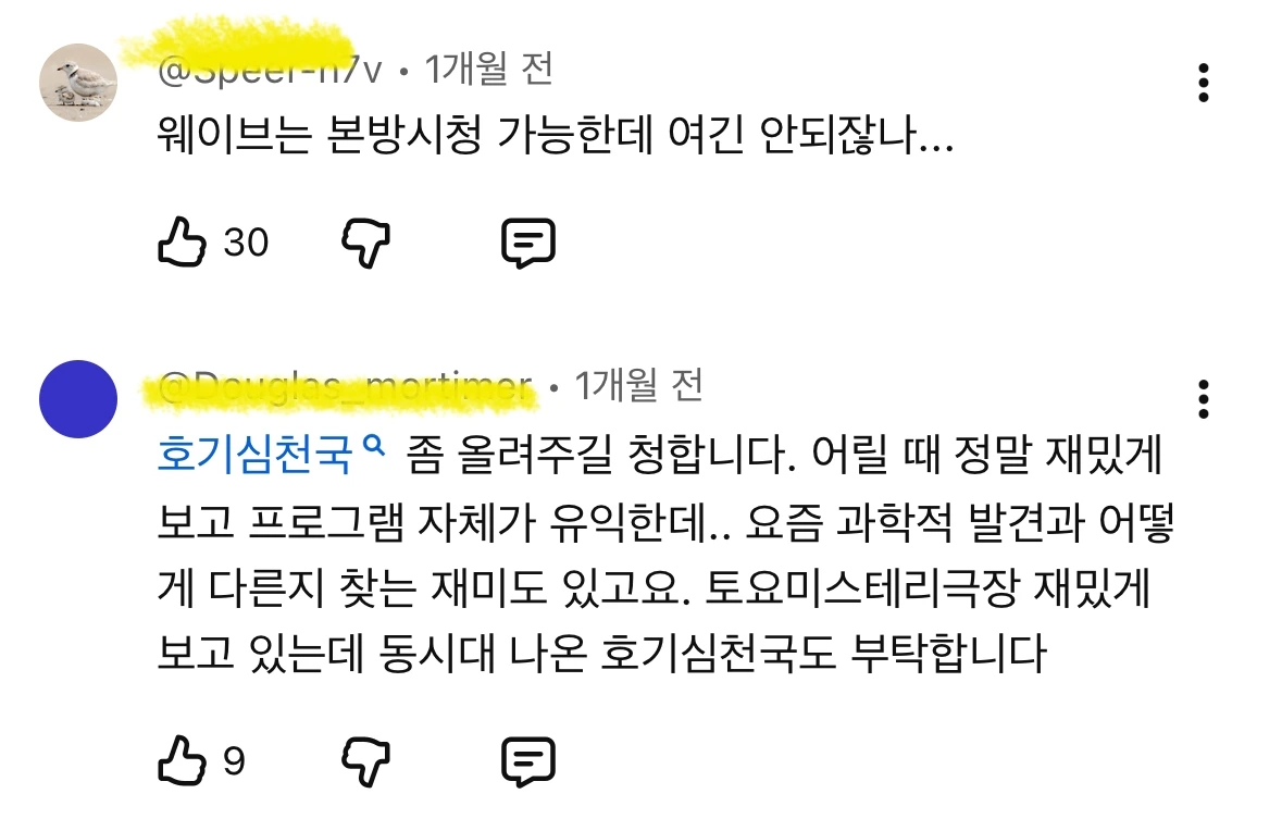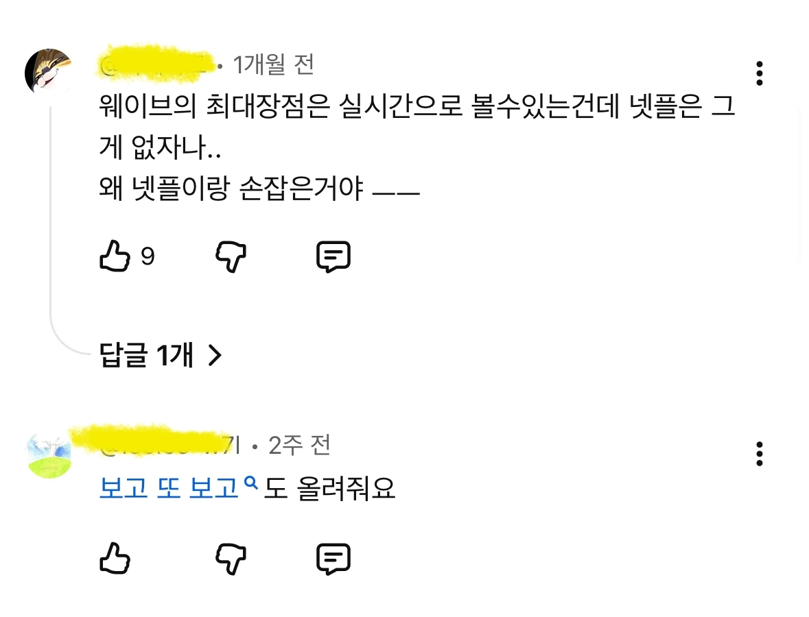 댓글을 보니 상기되긴 했지만 연애시대, 호기심천국 등 손에 꼽히는 수작들이 다시 보고 싶어지긴 한다. 게다가 웨이브에선 실시간 채널이 되는데 넷플은 안된다는 불만도 보인다.