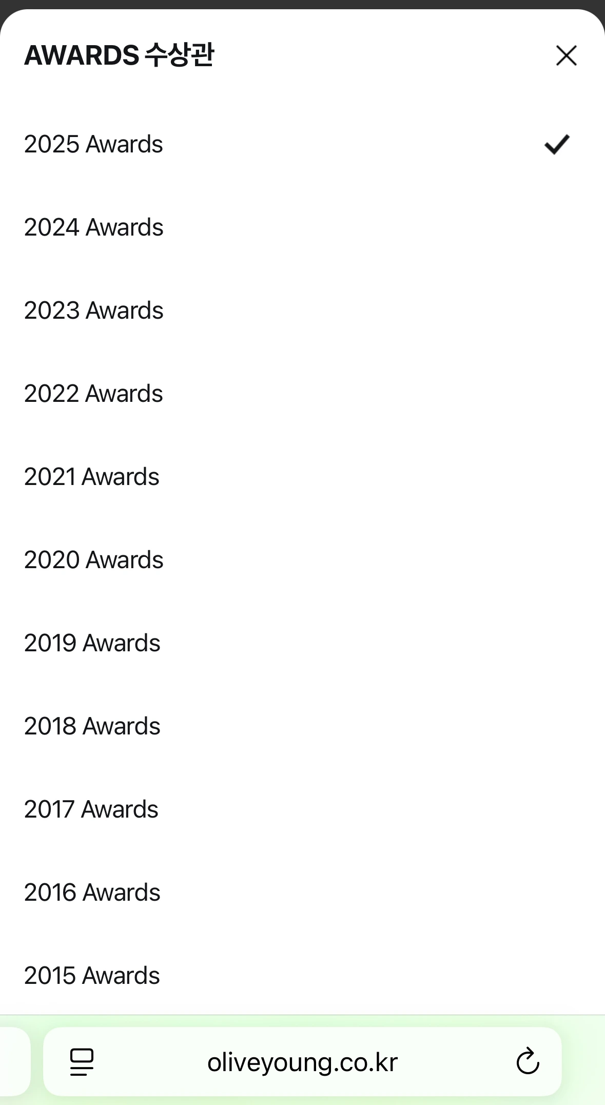올리브영 온라인 몰에 접속해 보면 2025 올리브영 어워즈 수상 제품이 깔끔하게 정렬되어 있다.