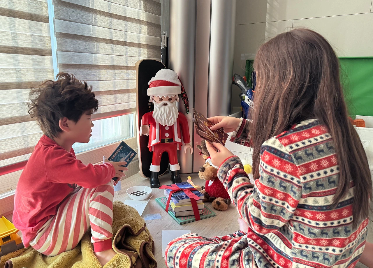 이미 엄마 아빠가 선물하는 걸 다 알지만 아이들이 잠든 후 우리 가족만의 플레이모빌 산타 트리 밑에 준비해 준다.