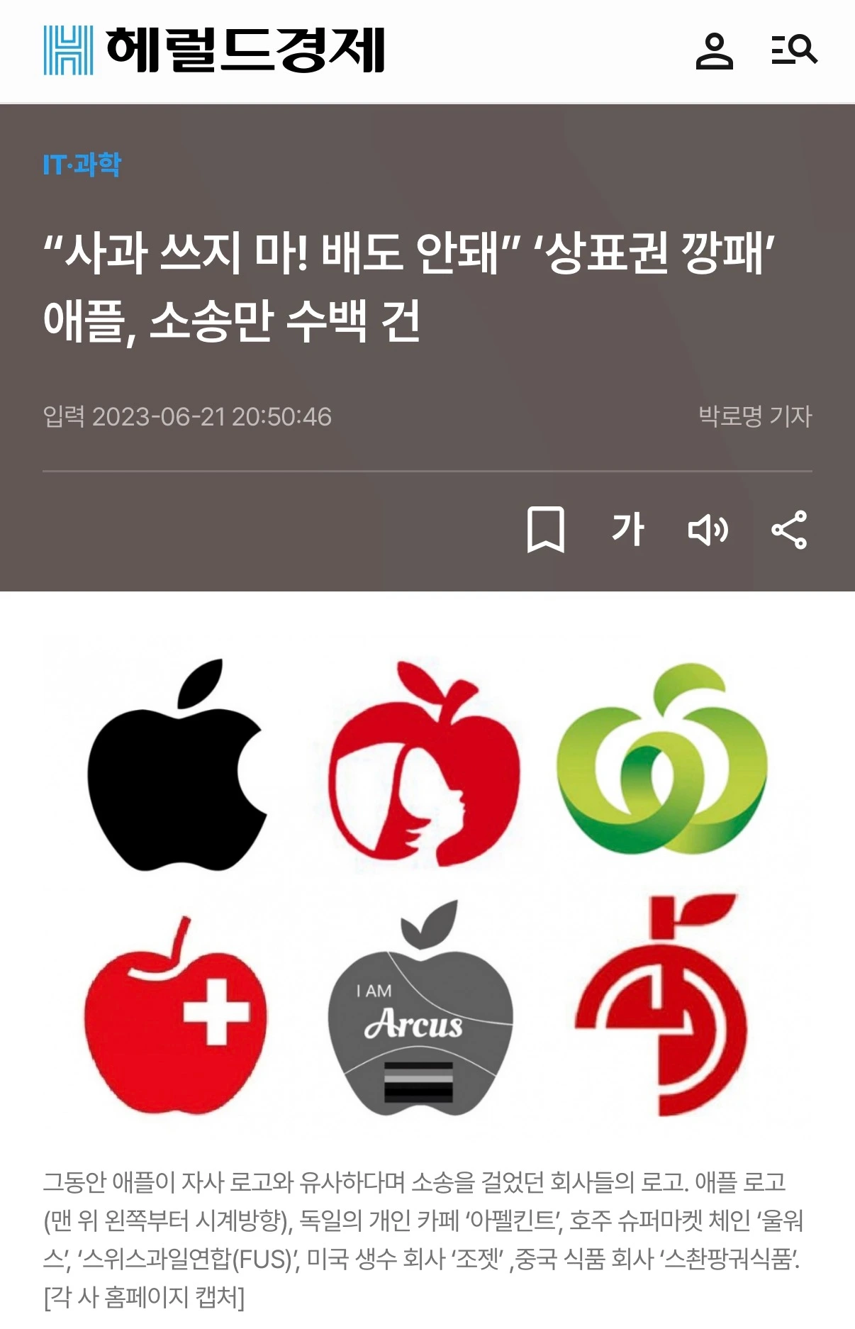 요즘엔 조용한 것 같은데, 예전엔 애플의 수백 건 소송이 꽤나 화제가 됐었다. 사과 모양 비스므리만 해도 소송을 거는 모습은 실제 승소 여부를 떠나 애플의 깐깐한 상표권 관리, 브랜드 이미지 보호 의지 표명에 큰 영향을 끼친다.