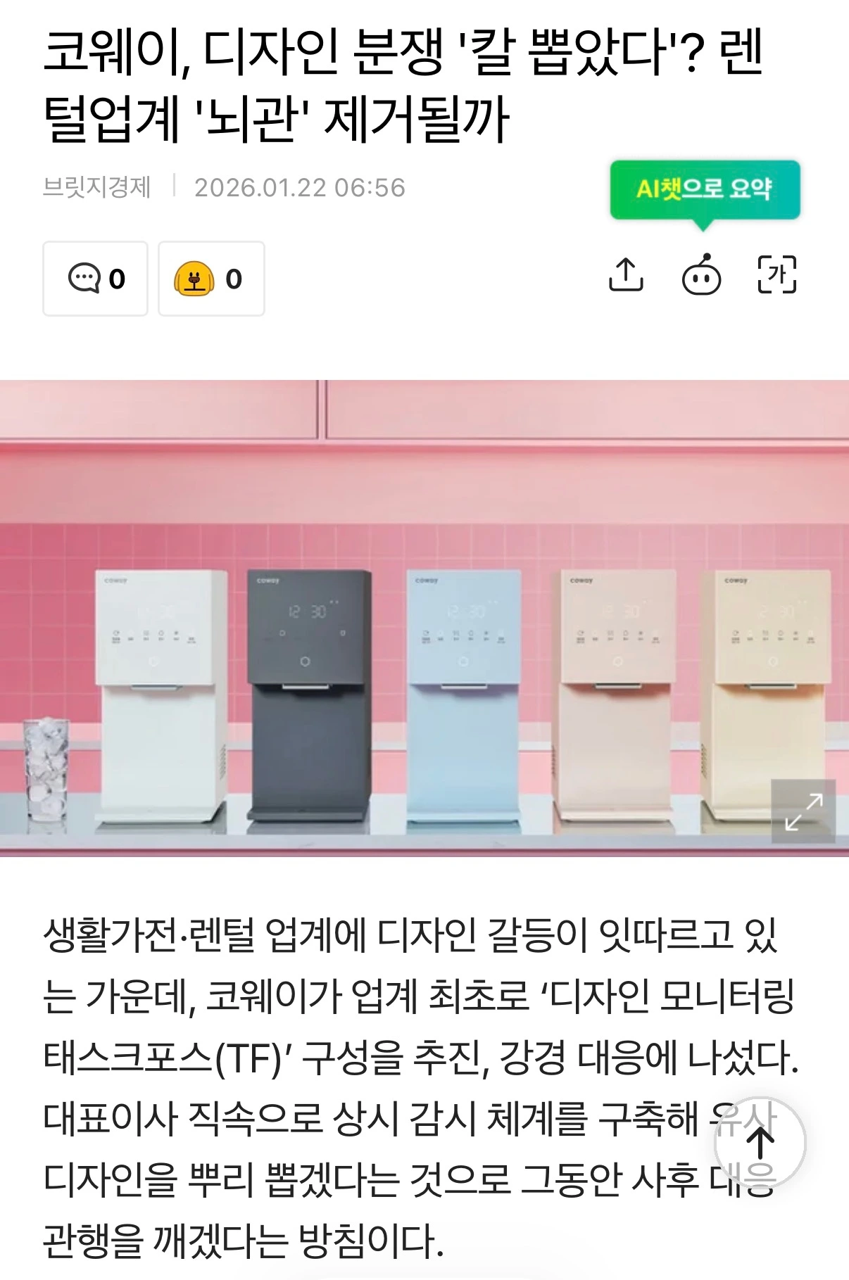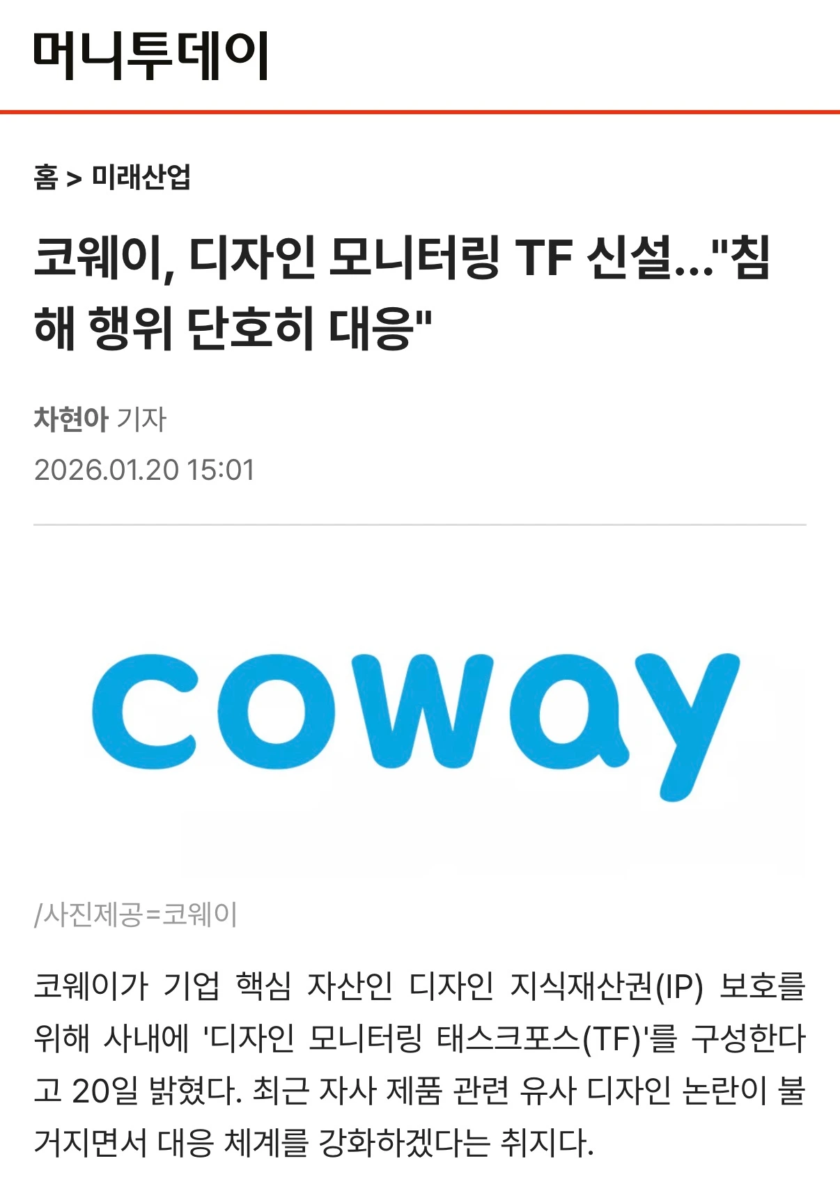 그간 코웨이가 얼마나 유사 디자인으로 피해를 봤는지 세부적인 내용은 잘 알지 못하지만, 분명 필요한 아니 탁월한 전략으로 보인다.