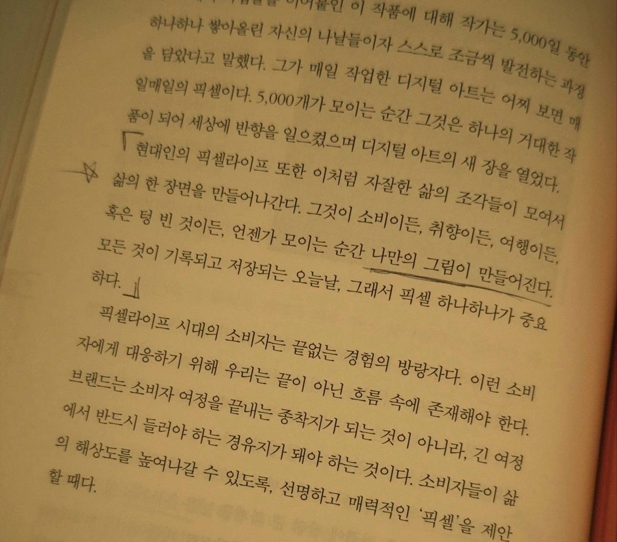 매일 의미 있는 시간으로 채우기 위한 긍정적인 생각과 실천들이 하나하나 픽셀이고, 나만의 큰 그림을 완성하기 위한 작은 조각들이라 생각하니 엄청나게 큰 동기와 위로가 되더라. 이 정도면 거의 문학책이라 해도 될 것 같다.
