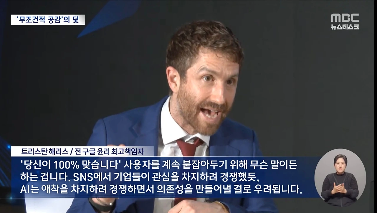 '당신이 100% 맞습니다' 사용자를 계속 붙잡아두기 위해 무슨 말이든 하는 겁니다. SNS에서 기업들이 관심을 차지하려 경쟁했듯, AI는 애착을 차지하려 경쟁하면서 의존성을 만들어낼 걸로 우려됩니다.