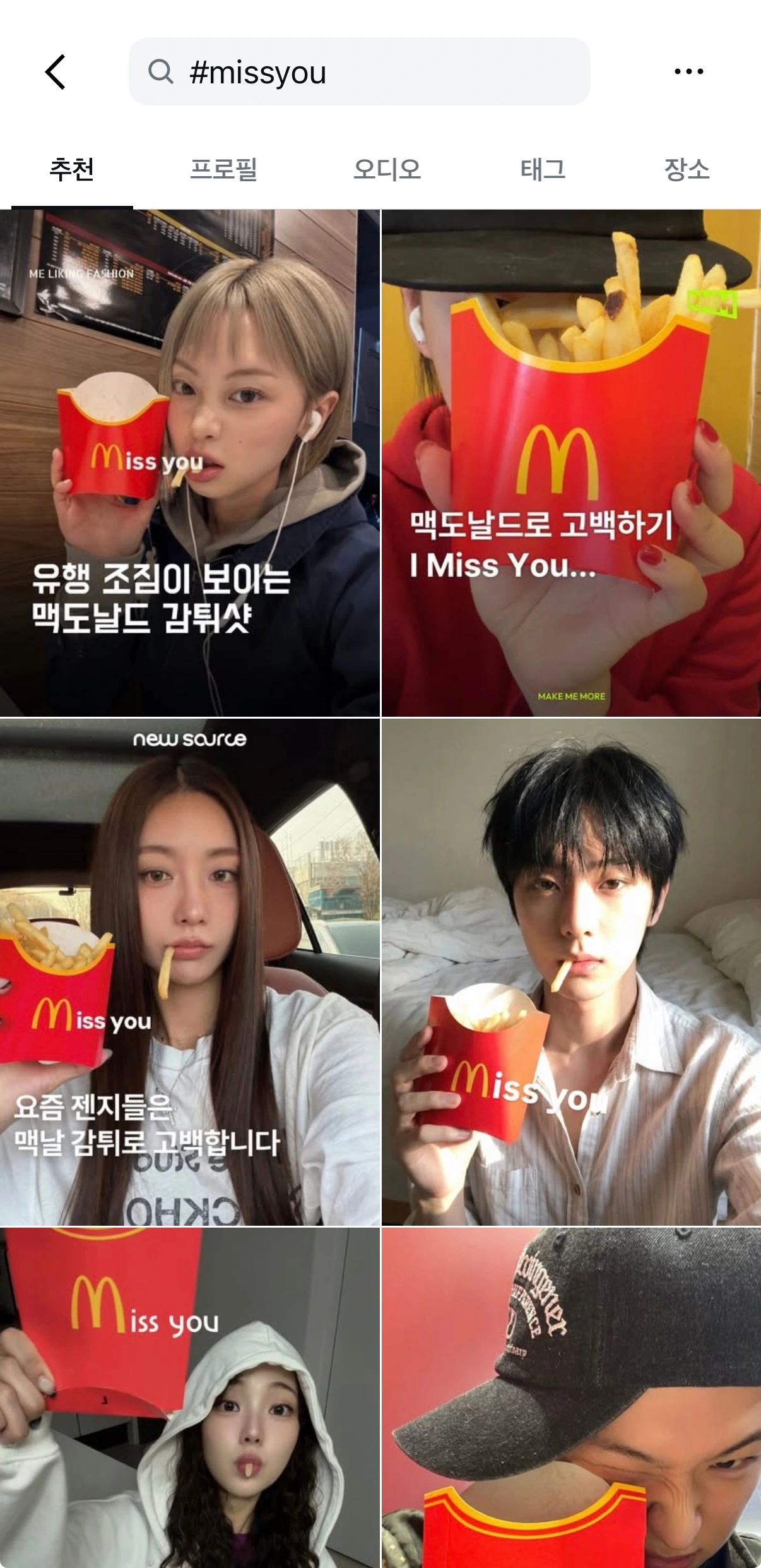 맥도날드 감튀에 새겨진 M 로고를 이용해 Miss you피드를 남기는 일종의 Gen Z식 고백 방법으로 소개된다.