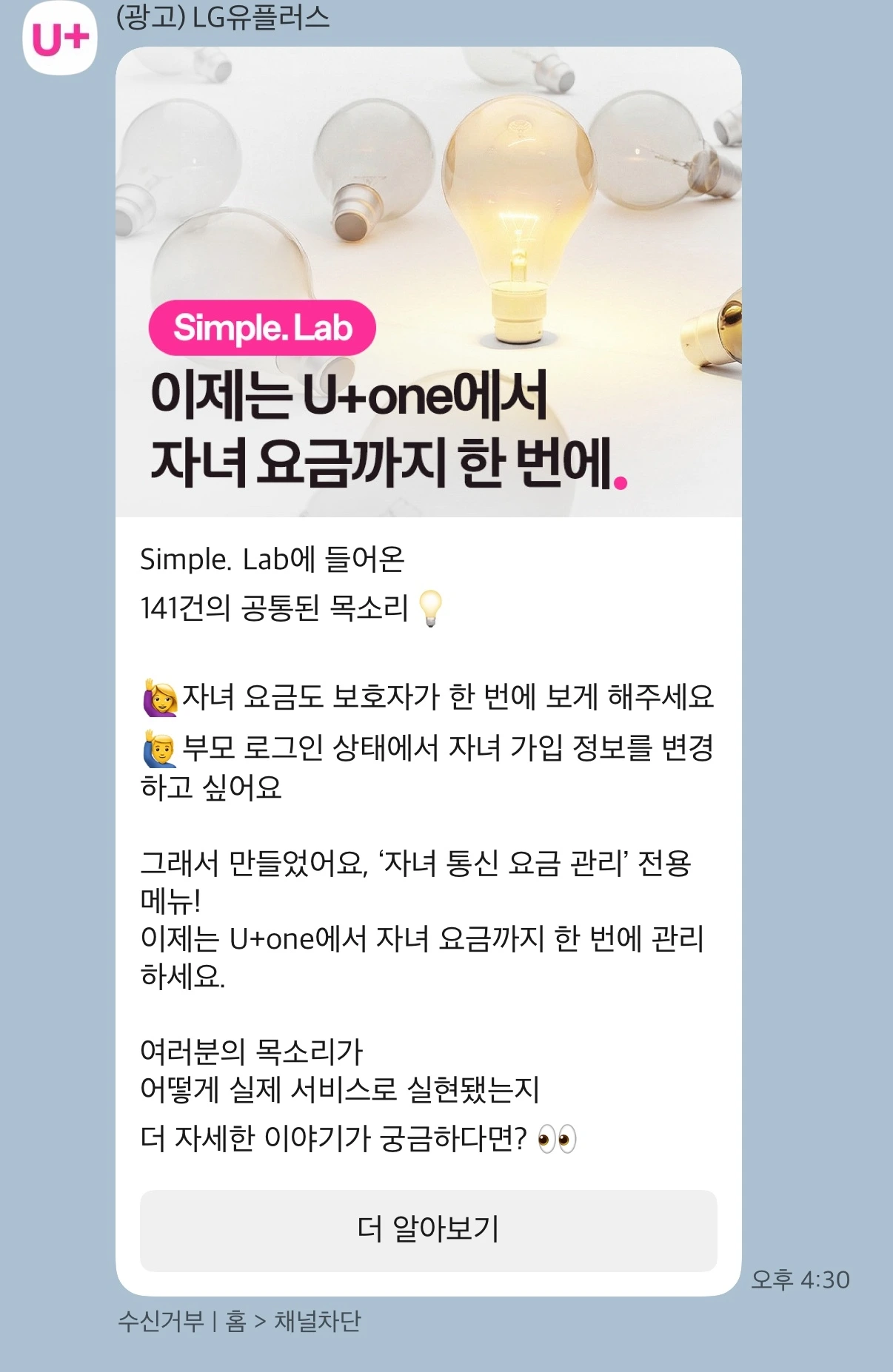반면 같은 유플러스 카카오톡 채널에서 발송하는 심플랩은 가독성이 훌륭하다. 심플리 유플러스 철학에 최대한 가이드를 맞춘 느낌이랄까.