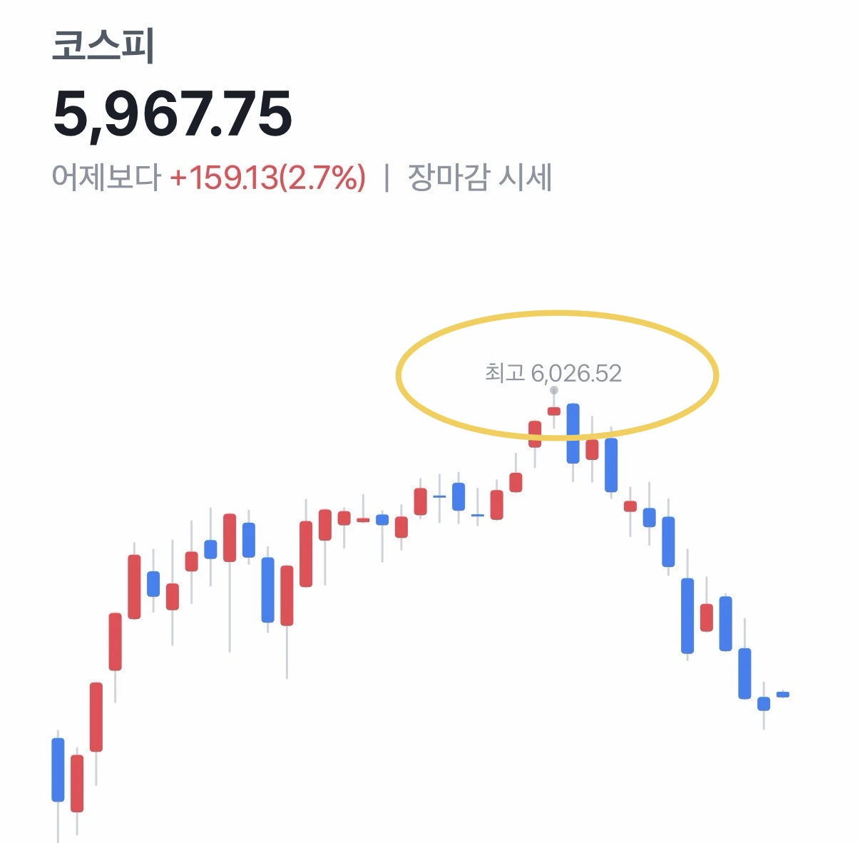 장마감은 5천9백 대지만 장중 6천을 다시 찍은 건 정말 감격이었다. 분명히 회복기로 가고 있다는 큰 상징이 됐다고 생각한다.