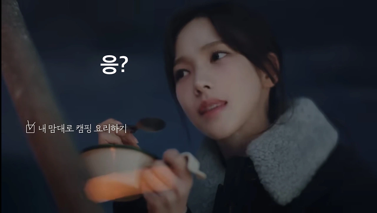 모든 게 완벽할 것 같은 그림같은 캠핑이지만 음식 맛을 보니 ’뭔가 빠졌나?‘ 하는 것 같은 귀여운 장면이다. (아니, 카리나 씨라서 그냥 귀여운 건가 ^^;)