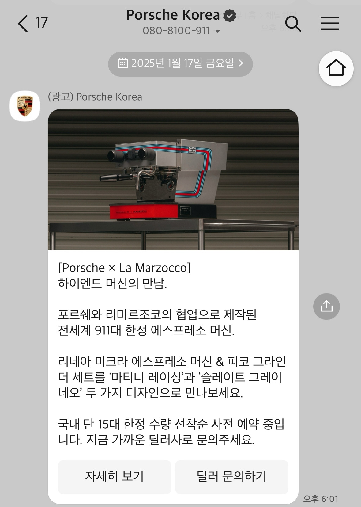 포르쉐 카카오톡 채널 광고를 통해 에스프레소 머신으로 유명한 라 마르조코의 한정판 에디션 소식을 접했다.