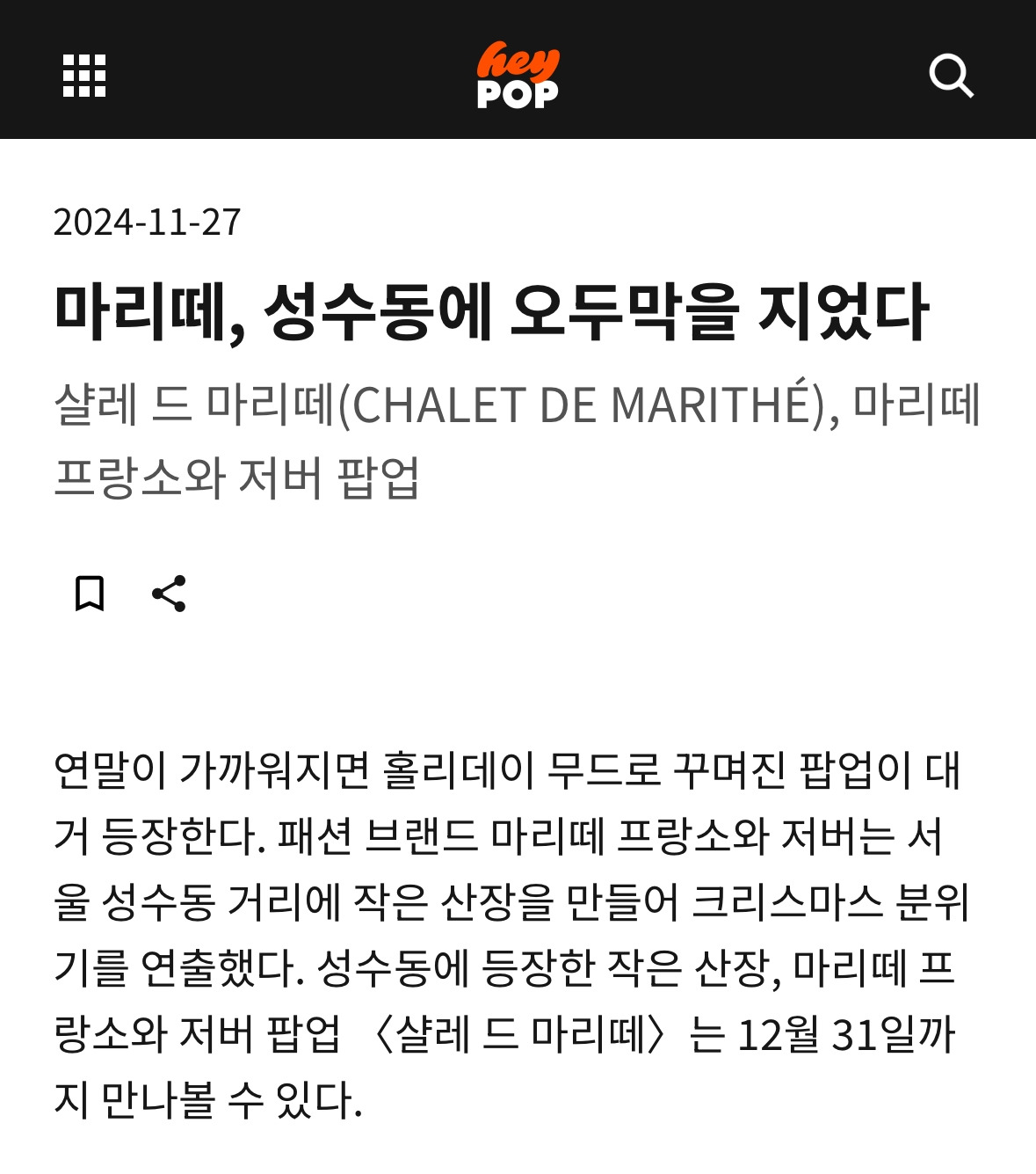 성수동 팝업스토어 소식을 봤지만 논평으로 다룰 생각은 못했는데, 며칠 후 마리떼의 또 다른 기사를 봤다.