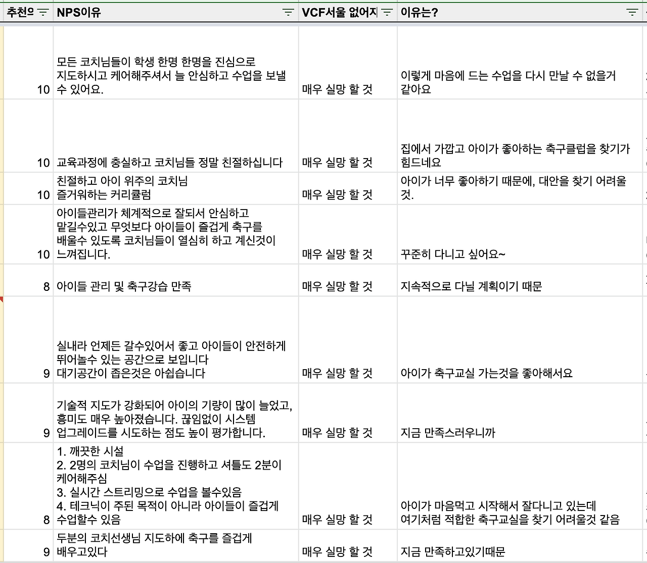 전체 고객 중 절반 이상이 응답한 조사결과는 감동적이었습니다. NPS 90%, 션 엘리스 테스트 92.66%의 경이로운 결과가 나왔기 때문입니다. 사실상 축구교실 비즈니스의 테슬라 같은 제품을 만들었다는 생각이 들었죠. Stage1의 두 번째 단계도 클리어 한 것입니다.
