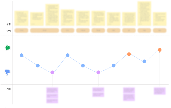 인터뷰와 설문내용을 바탕으로 고객 여정지도를 그려봤습니다. 영업기밀(?)이기에 화질이 낮은 사진으로 실루엣만 공유합니다.