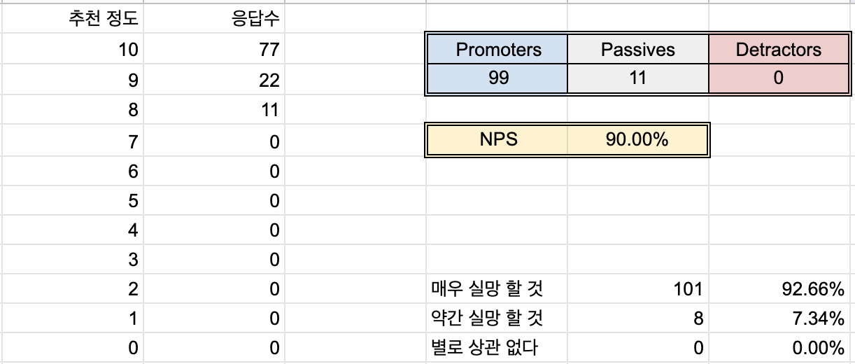 우리가 정한 1분기 Key Result 2가지는 회원 수 350명 달성, NPS 80% 달성 이었습니다. 아쉽게도 회원수는 200명만 달성 했지만, 두 번째 KR을 판단하기엔 충분한 숫자였습니다.