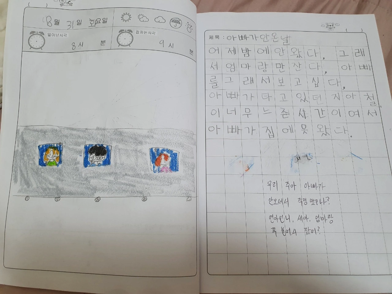 나는 회사 얘기하는걸 극도로 싫어한다 직장인이라는 가면 하나만으로도 혐오스러운데 이렇게 글을 쓸수있는 신성한 시간에 회사를 상기시킨다는 거 자체가 극극극!혐이기때문이다 하지만 오늘은 회사에 대해 좀 얘기해보려 한다 오랜만의 느끼는 분노와 짜증을 분출시키기 위해서다 그러니까 3일전 일요일부터 초과근무가 시작되었다 일요일부터 오늘 수요일까지 연짝으로 자정 퇴근이다 어제는 막차를 놓쳐 근처 처가에서 잠을 잤으니 집에 있는 가족들도 기가 찰 노릇이지... 평소 이런모습에 익숙치 않은 아이들도 황당해 한다 둘째가 어제 이런 일기를 썼다니 완전 슬픈현실이여