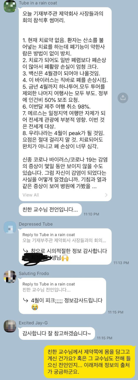 얼마 전에 내가 속한 세미나 단톡방에서 어떤 교수님께서 코로나와 관련된 정보를 공유하셨다. 그런데 나는 가만히 읽다가 그 안에 무언가 잘못된 정보가 포함되어 있다는 사실을 알게 되었다. 이번 신종 코로나 바이러스는 치료가 되어도 대부분의 환자가 폐 손상이 너무 심각하다는 내용이다. 그러나 이는 사실이 아니다. 왜냐하면 나는 그 이전에 위 기사를 통해서 대부분의 환자들이 폐가 복구불가능할 정도로 크게 손상된다는 사실이 그리 신빙성이 없다는 것을 알게 되었기 때문이다. 논리적으로 따지면 교수님의 전언과 위 기사의 내용은 서로 모순되므로 둘 중 하나의 내용만 참이어야 한다. 그런데 상식적인 기준으로 생각해봤을 때, 별도의 출처도 없고 사실이라는 것이 확실치도 않은 전자보다는 출처도 확실하고 그에 따른 체계적인 근거가 덧붙여진 후자를 신뢰하는 것이 합당해보인다.